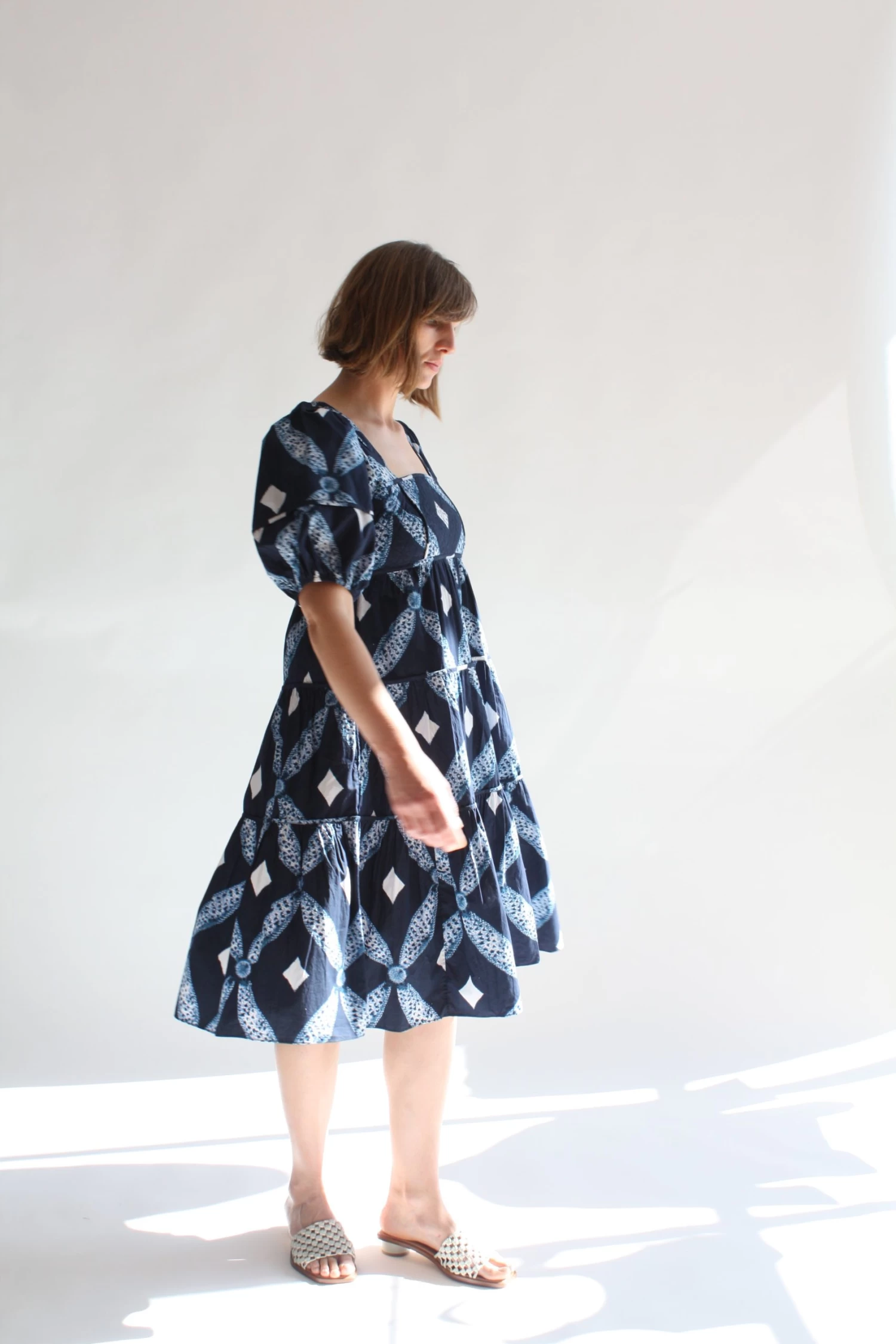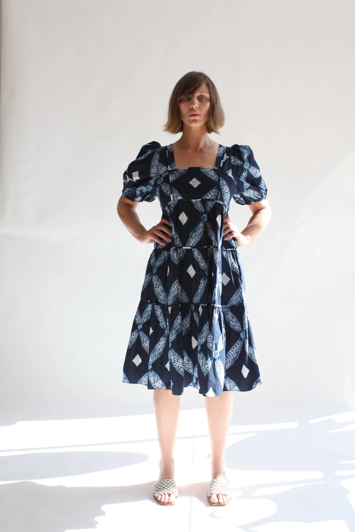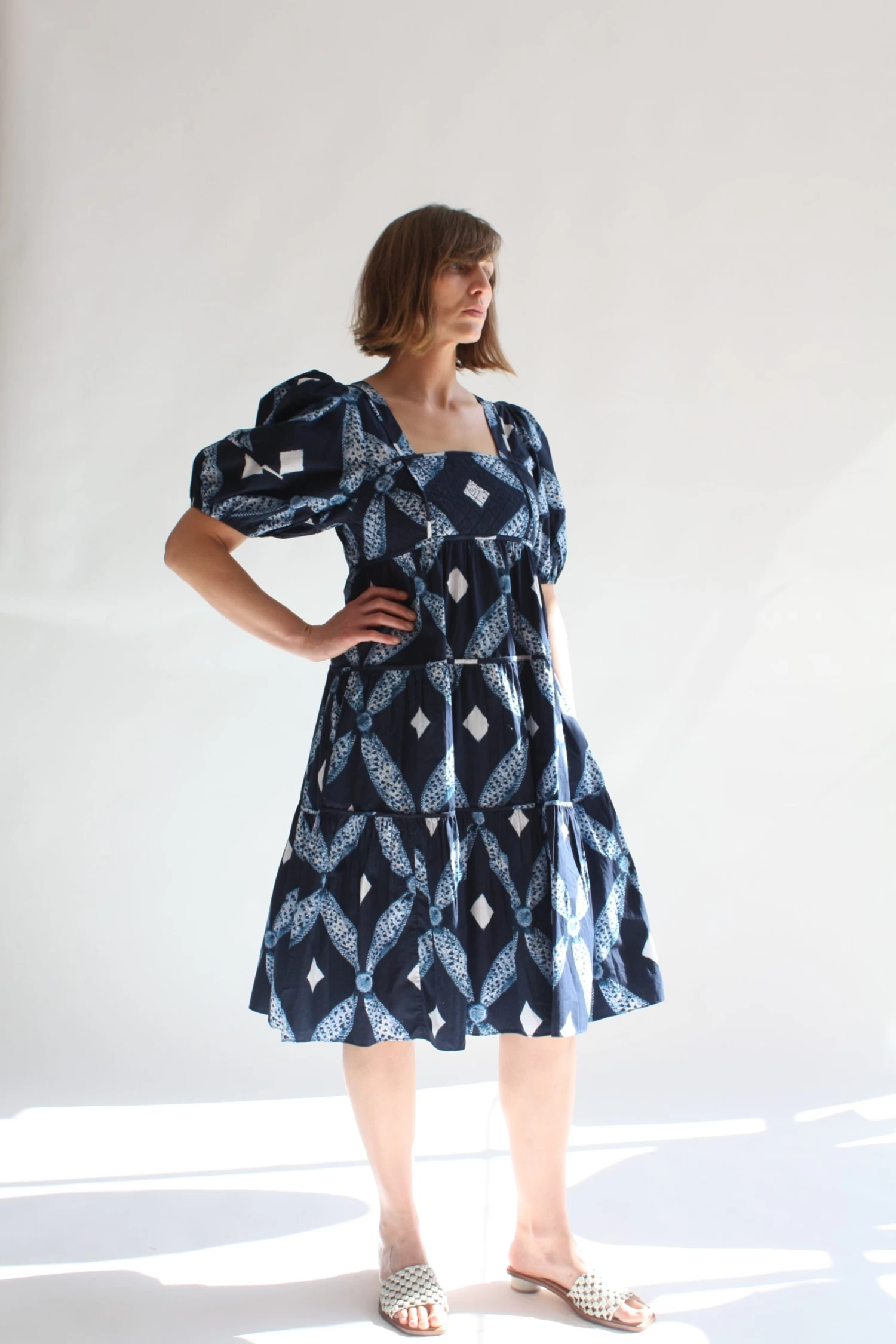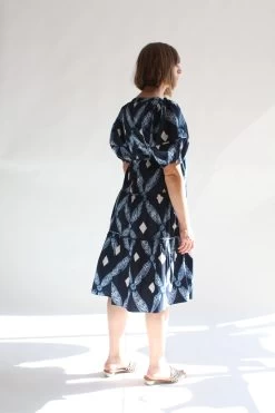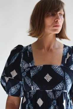 This square necked frock features a fitted quilted bodice, voluminous tiered skirt, and full sleeves in a shibori diamond printed cotton poplin. Back zipper closure.