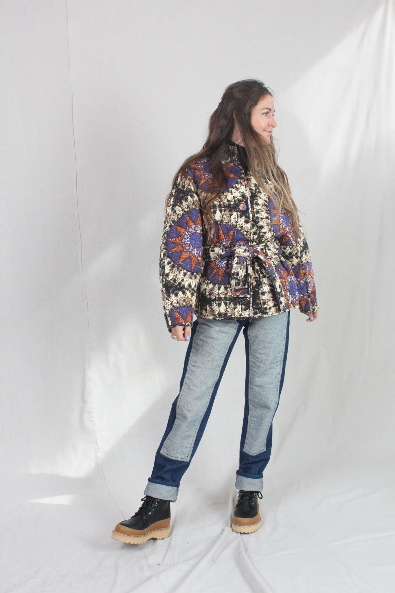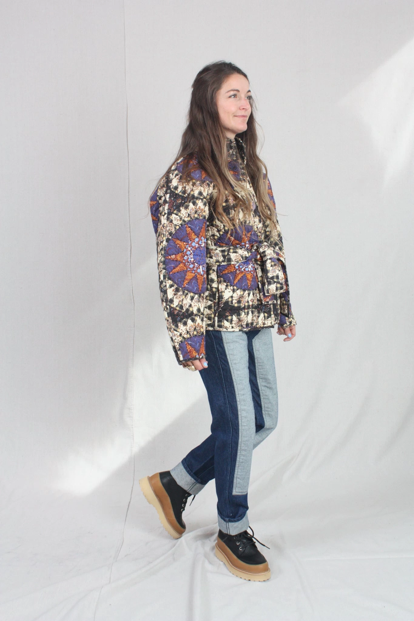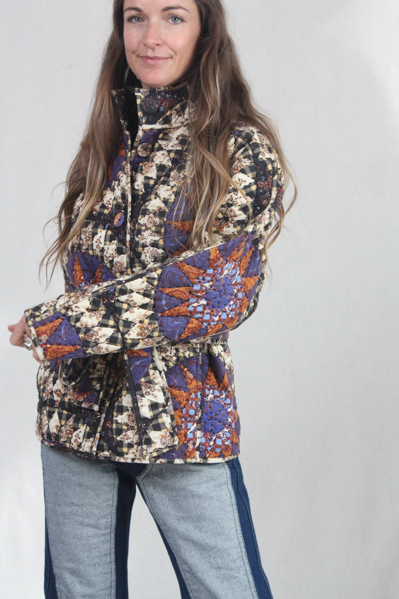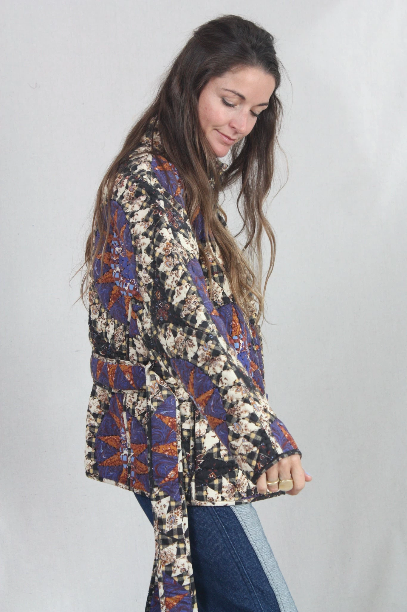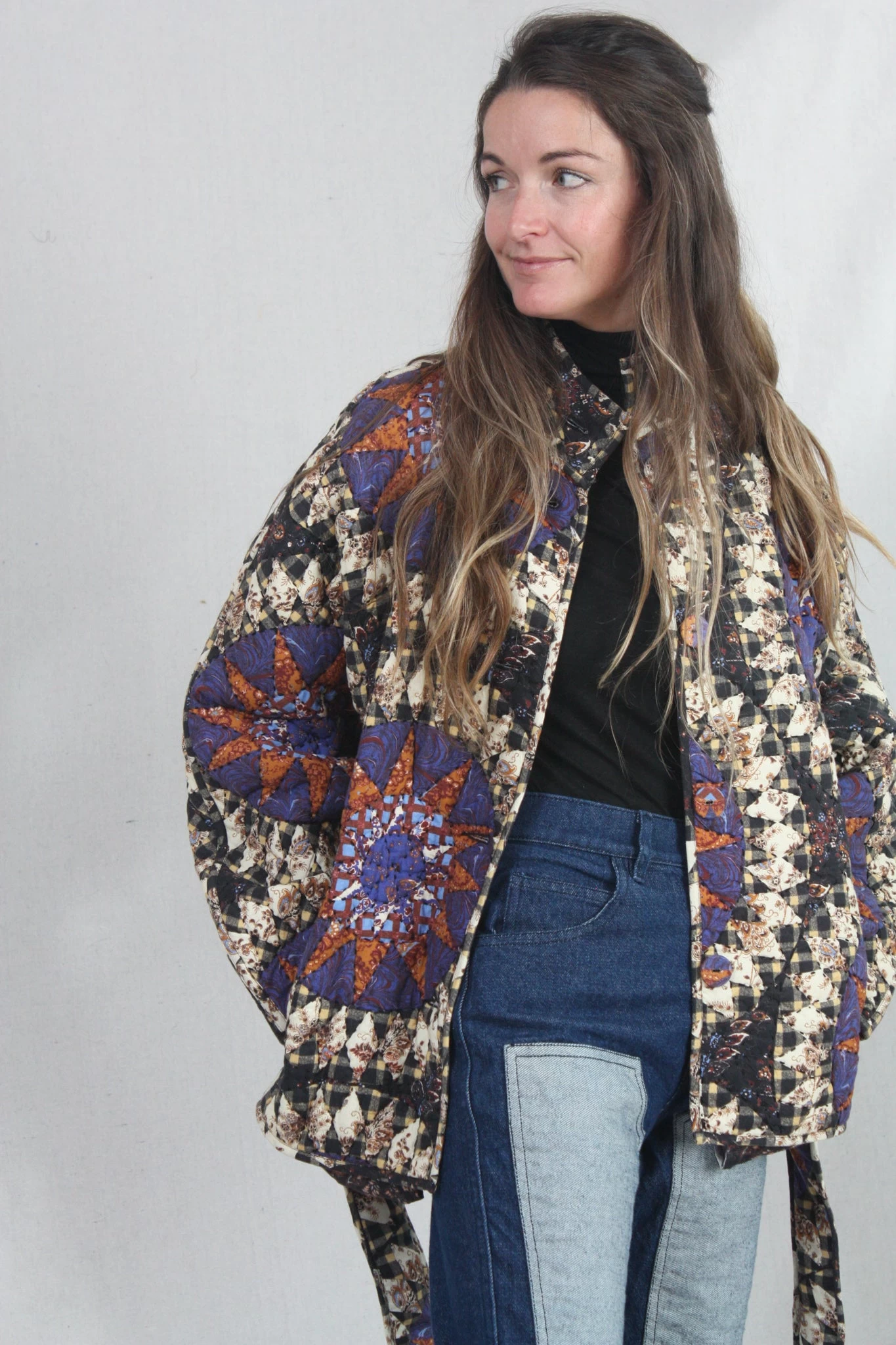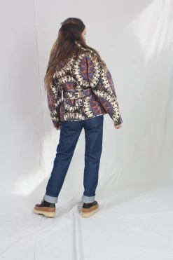 The Paige Jacket is made from a signature quilted cotton that features an oversized constellation motif in hues of yellow, henna, purple and black. This piece has geometric patterns decorating its kimono-style sleeves and wrapped bodice.
