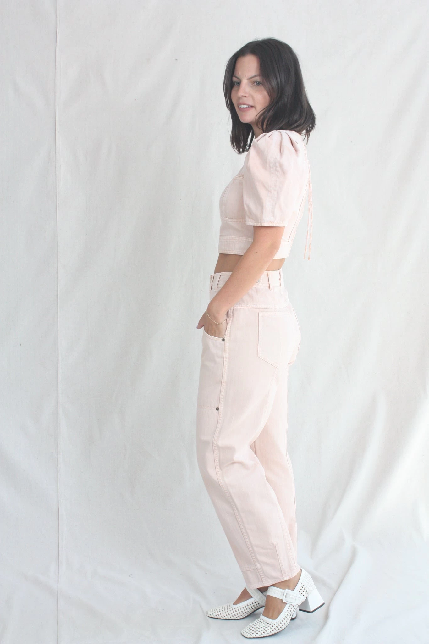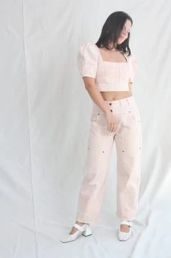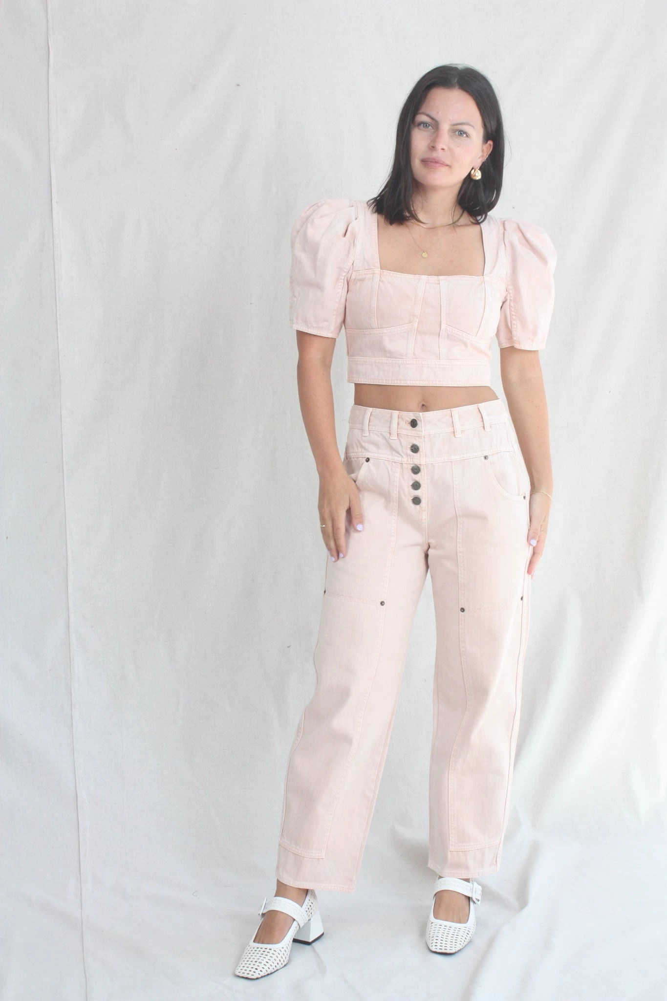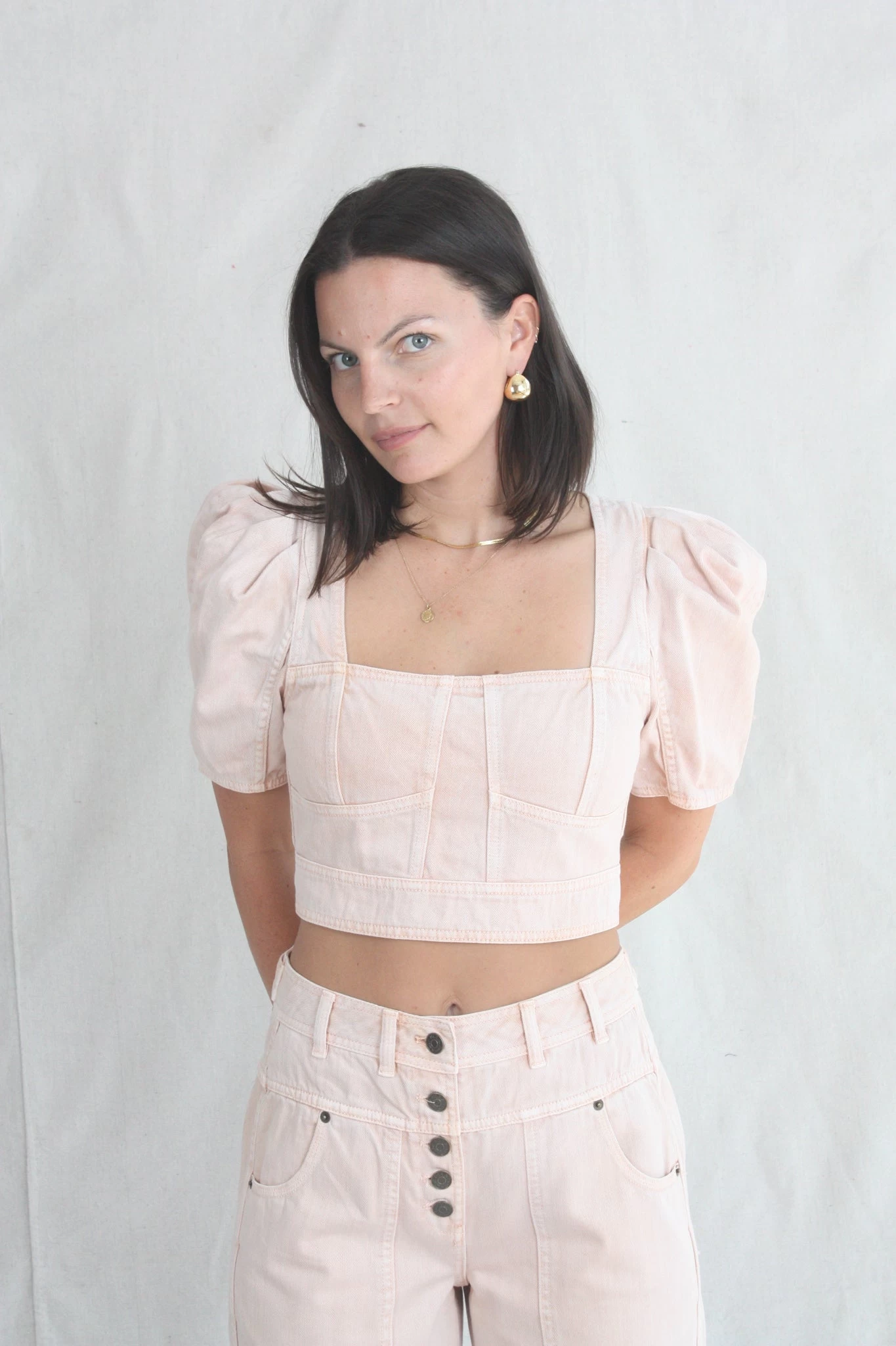 The Renee Top is a fitted crop top, seamed throughout the bodice with cups and princess seams to define its shape. Features short puff sleeves, a square neckline and back zip closure.