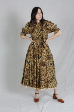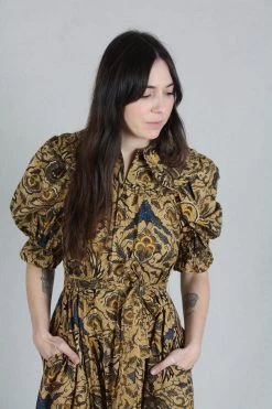 The Rosalind Dress is cut in our signature cotton poplin, and designed with our printed Batik fabrication. Cosmic, motifs of winged trees and vines speak to the mystery and beauty of nature in this earthy colorway. This midi-length frock features structured sleeves and exaggerated collar with twisted bubble trim. Topstitched sash defines the waist, or can be removed for a more flowing silhouette.Â