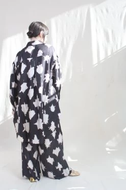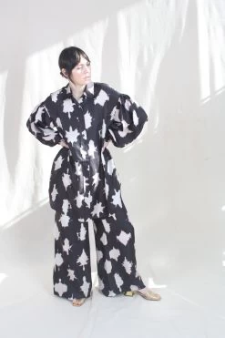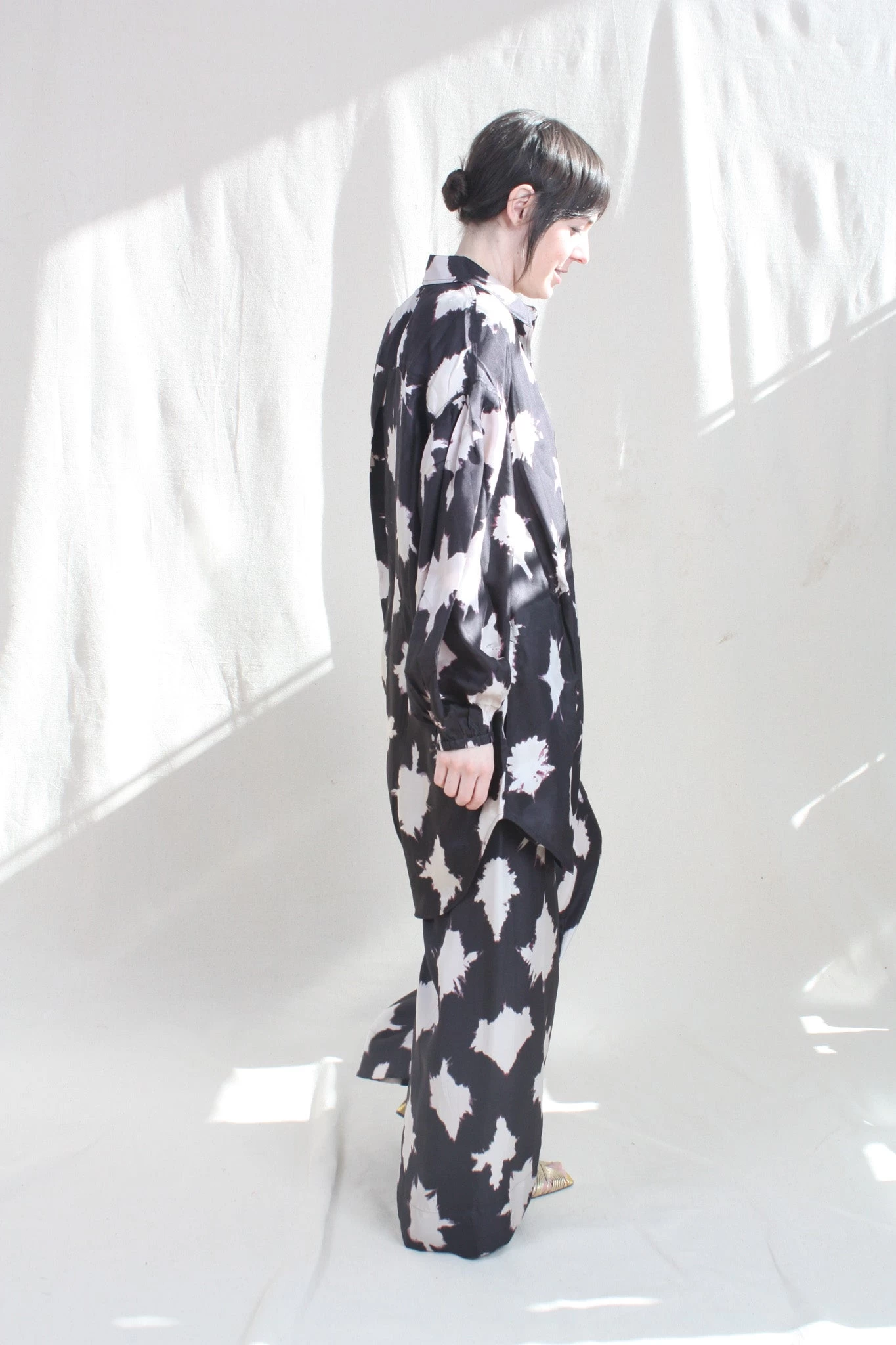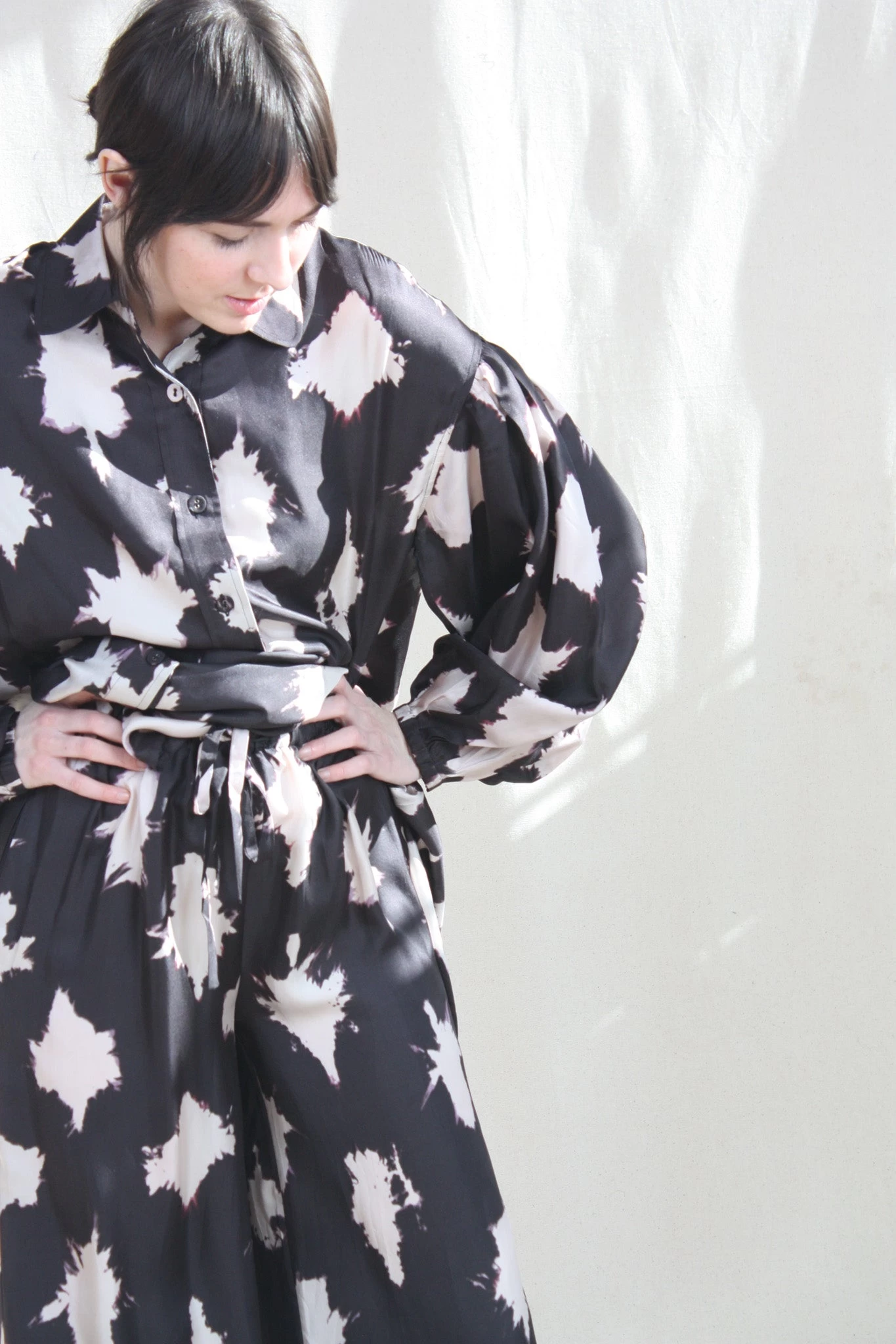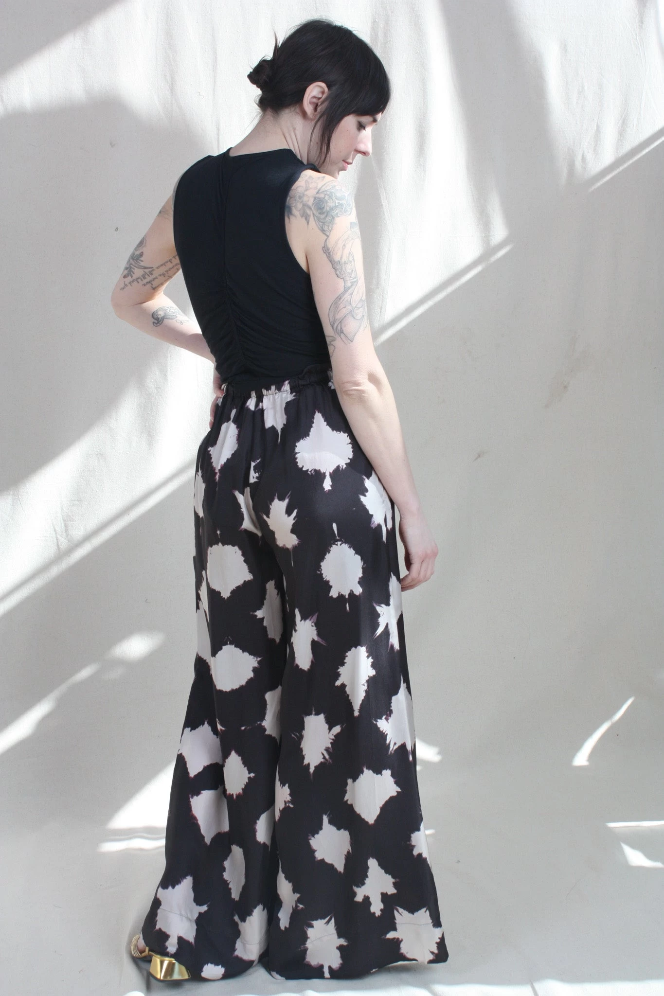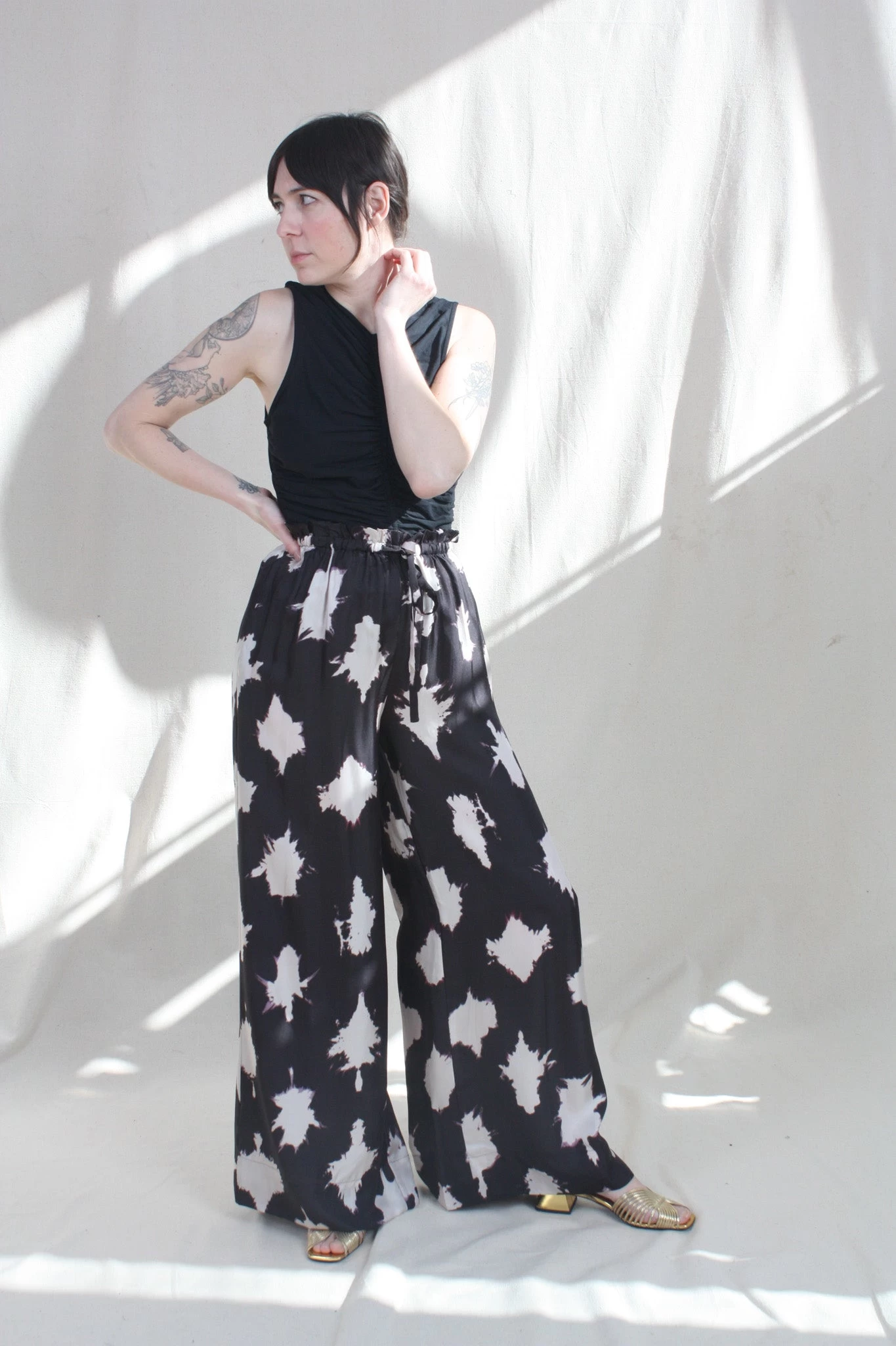 The Sawyer Pant is made from prismatic silk twill, a lightweight black fabrication printed with shibori motifs. This breezy, wide-leg pant features a high paperbag waist, an elastic drawstring waistband and side-seam pockets. Inseam: 30 ½ inches.