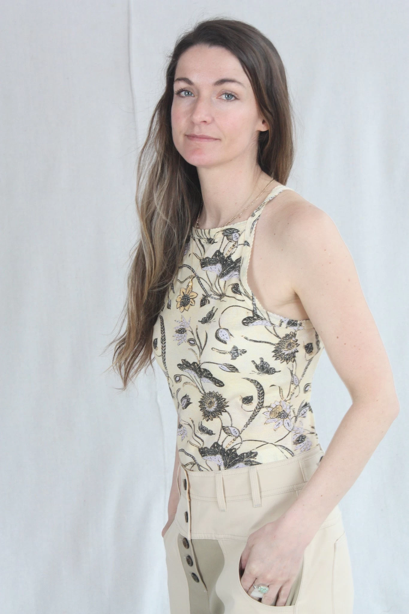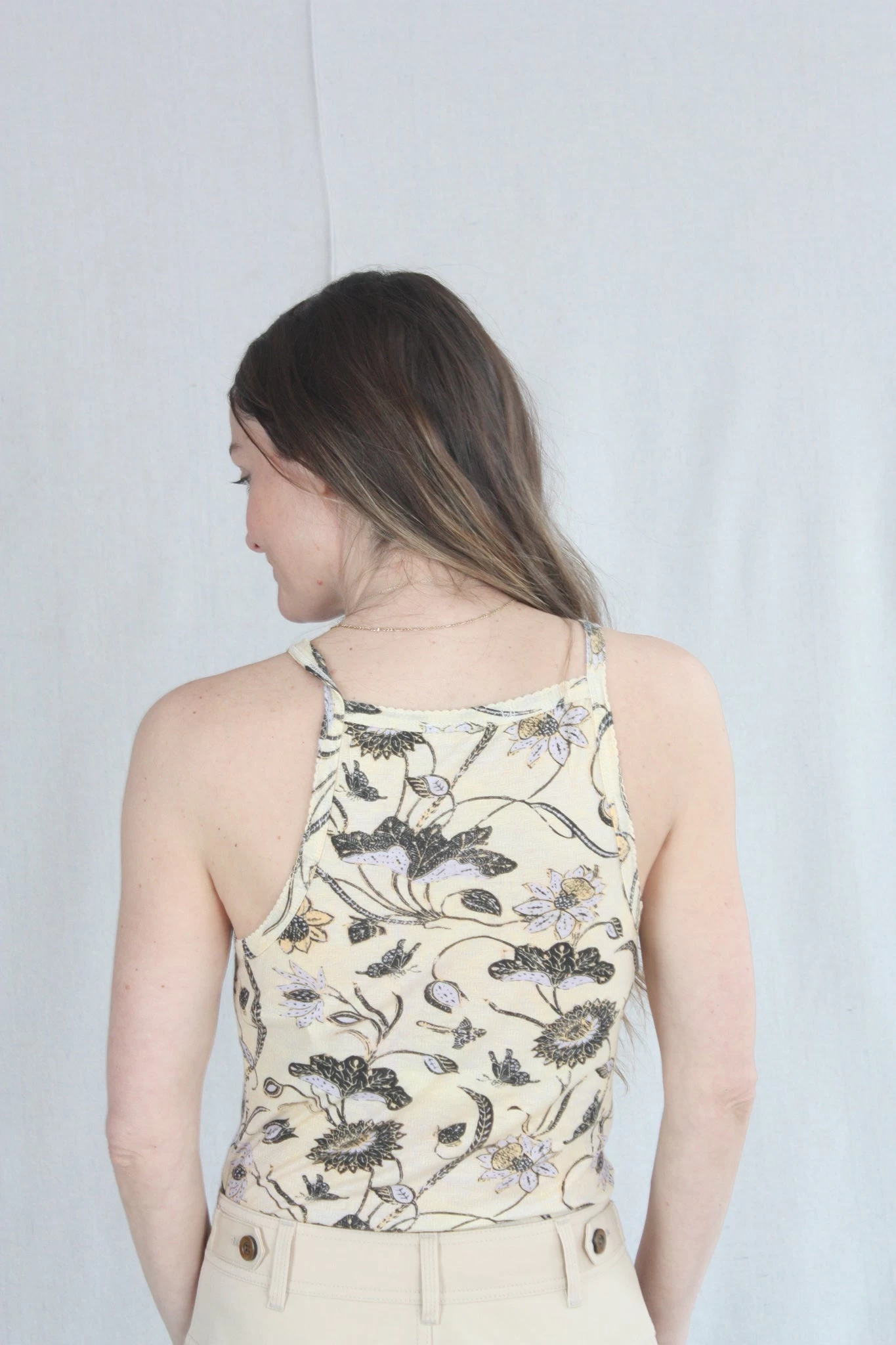 The Sidney Cami is a lightweight cotton underpinning, patterned in blooming florals. This cute cami features thin, scalloped straps and a high-neckline.