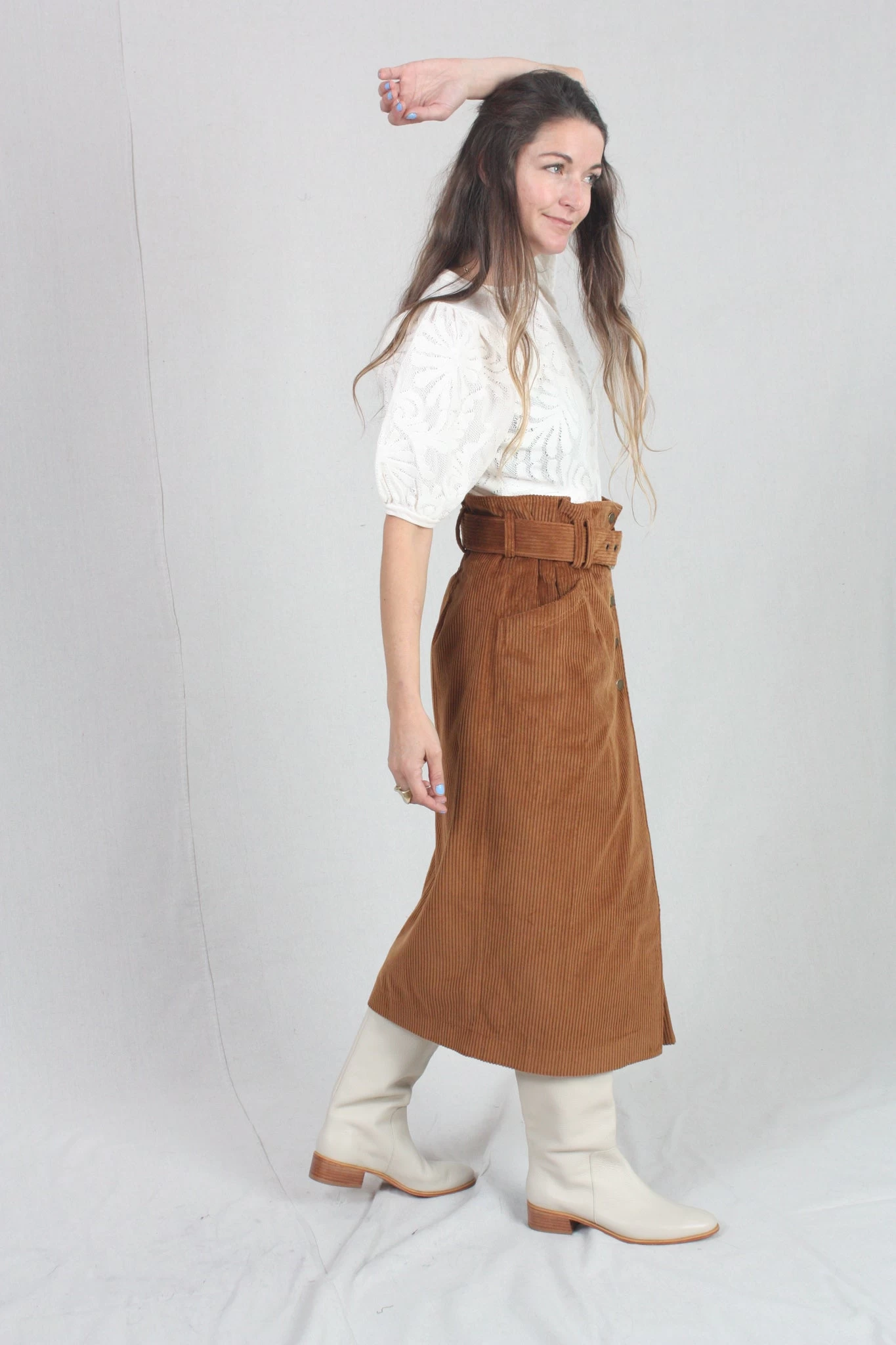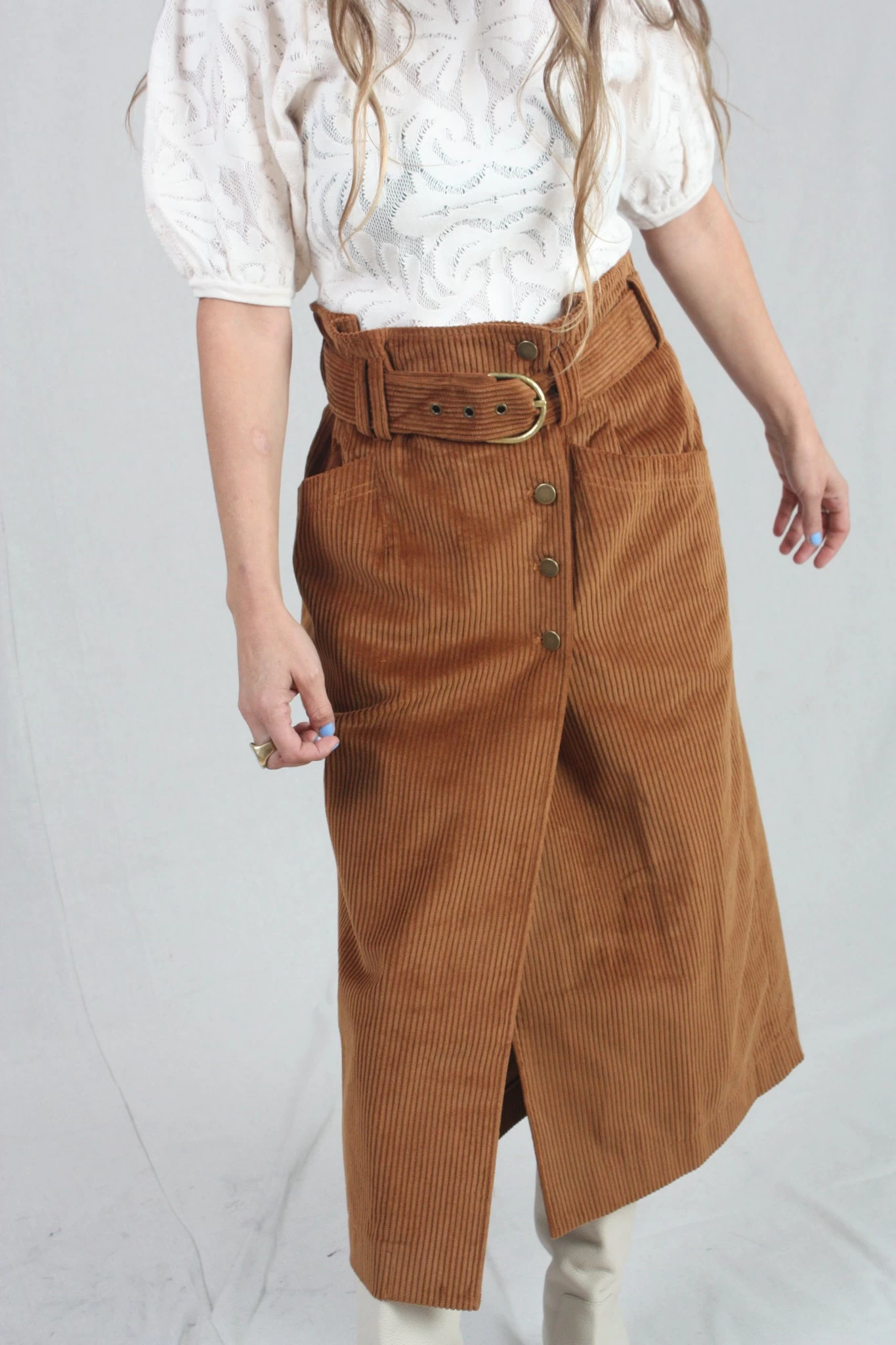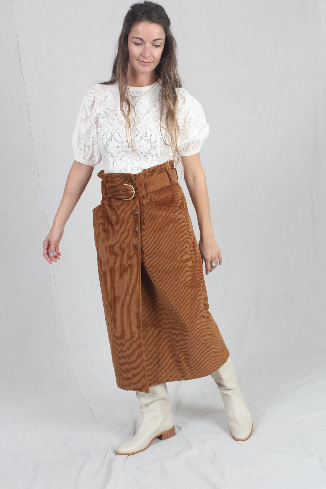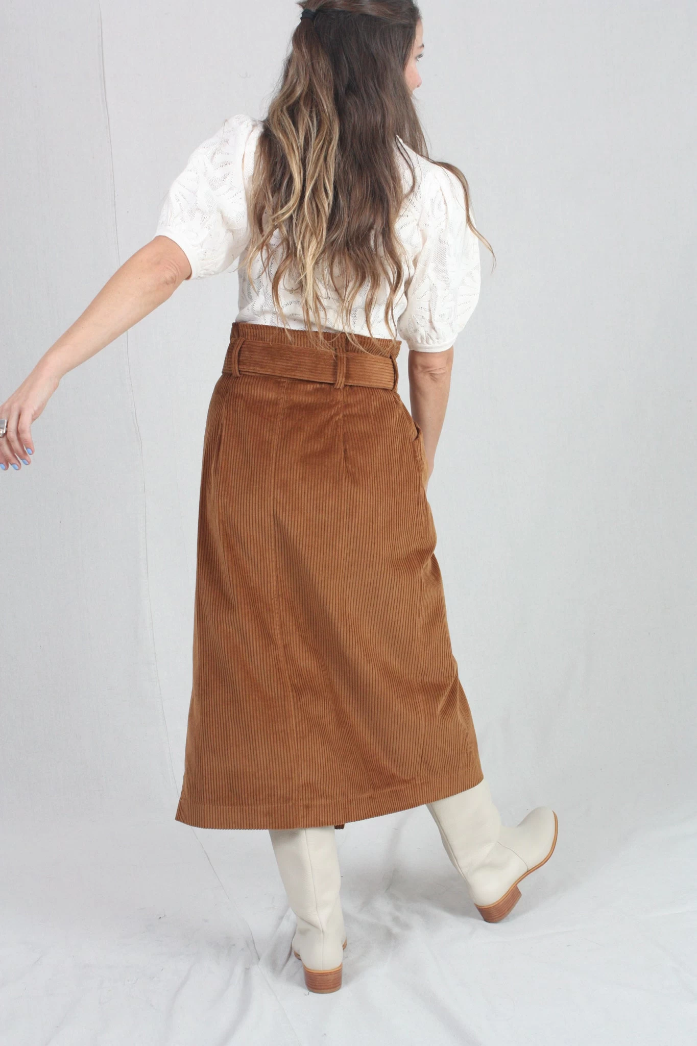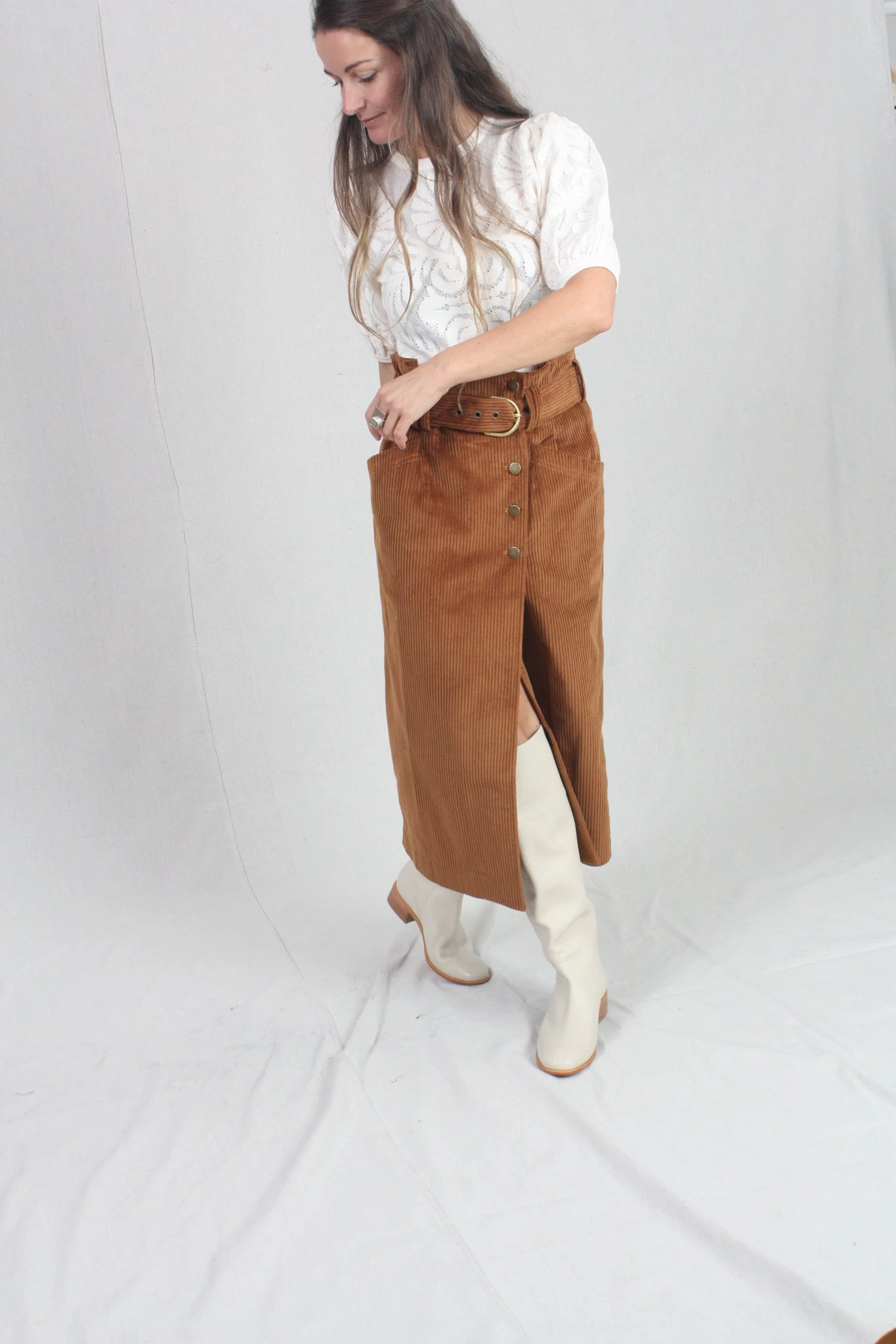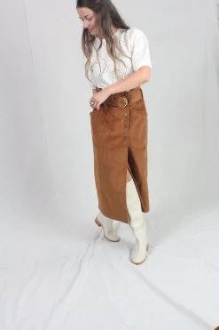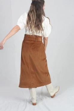 The Sonia Skirt is made from soft velvet corduroy in the perfect fall hue of Umber. This elevated wrap-style pencil skirt features a paperbag waistline, front slit, and matching belt that is finished with an antique brass D-ring.