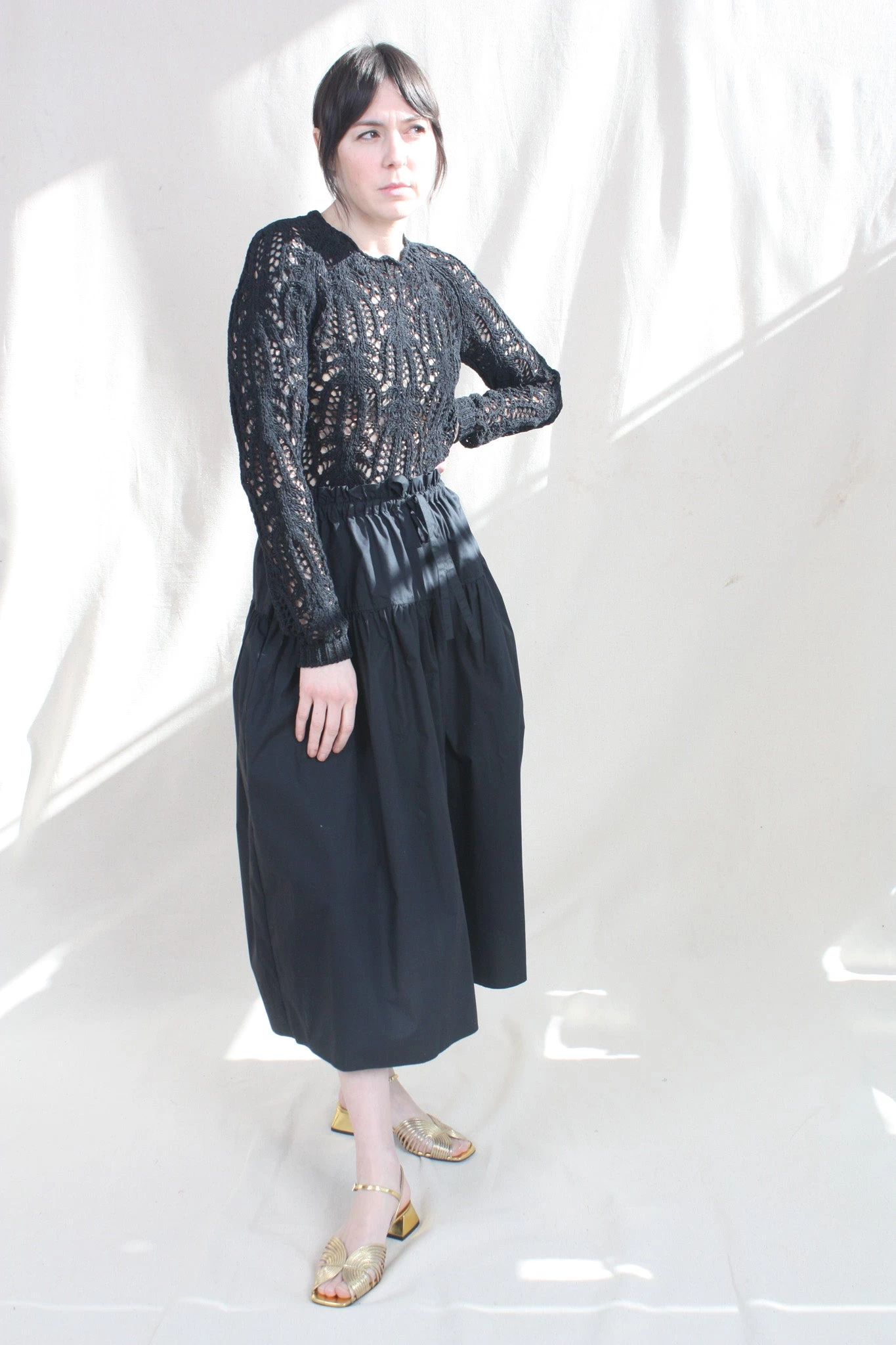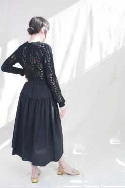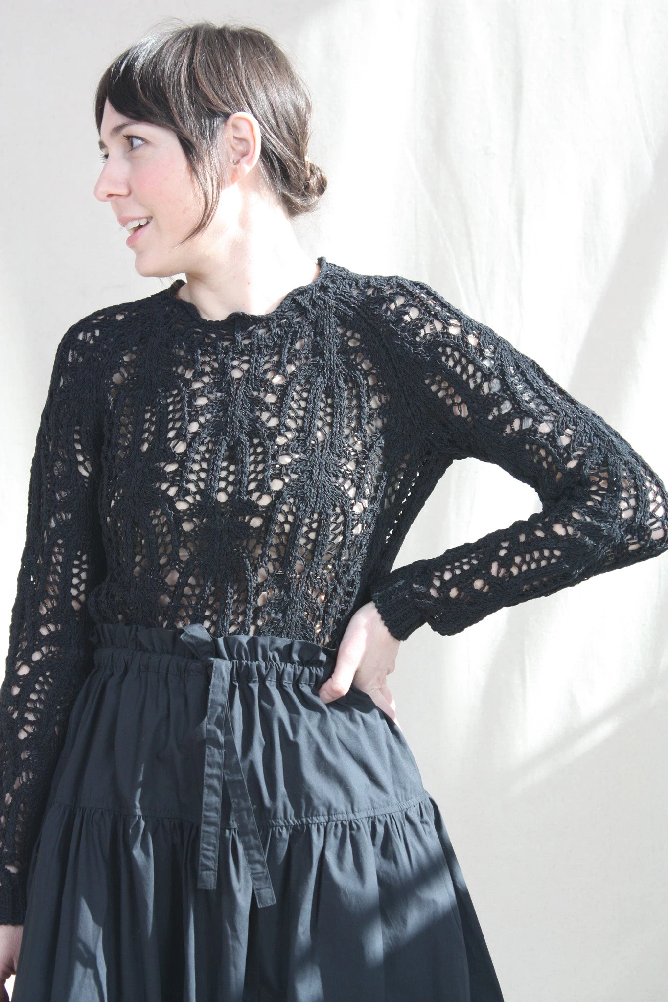 The Tania Pullover is a crochet knit sweater great for layering. This slightly cropped style features a scalloped crewneck and long sleeves.