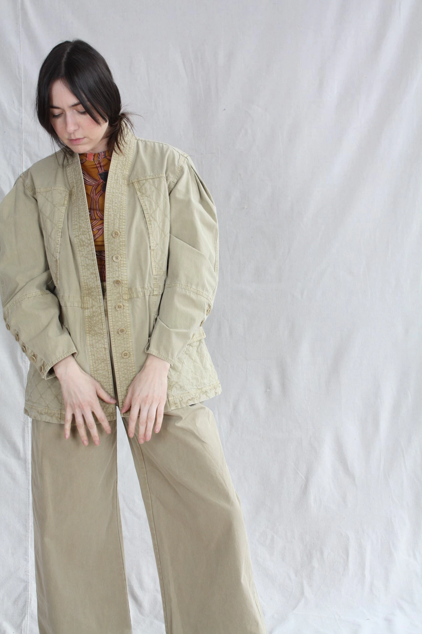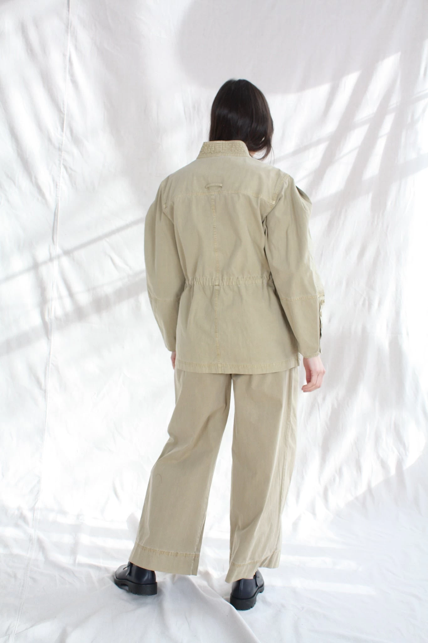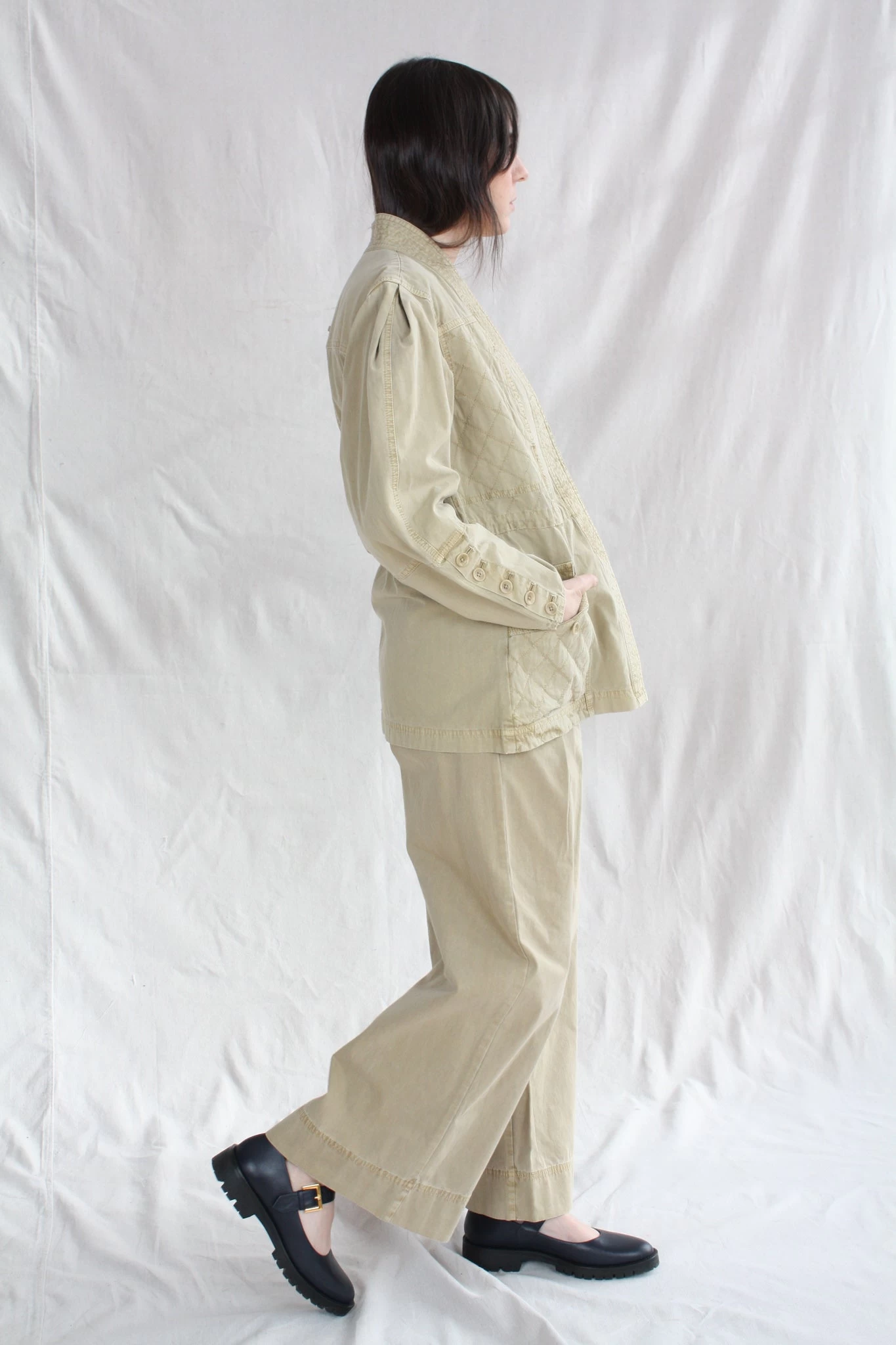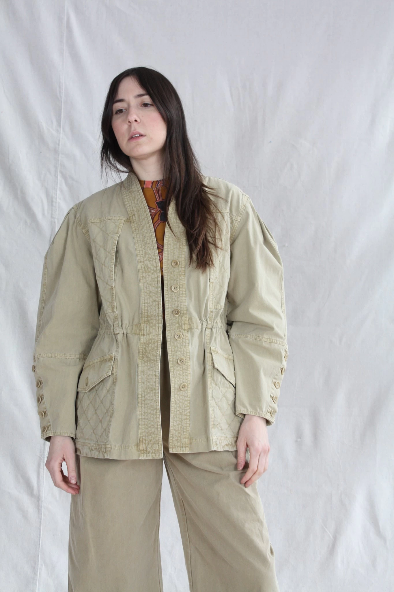 The Terrie Jacket is a classic Ulla Johnson silhouette, designed with full shaped sleeves, kimono style lapel and cinched nipped in waist. This utilitarian style jacket is oversized in the sleeves, allowing for a comfortable fit over all of our voluminous silhouettes. Features quilted stitching along the bodice, patch pockets and tonal buttons adorning the sleeve cuffs.Â