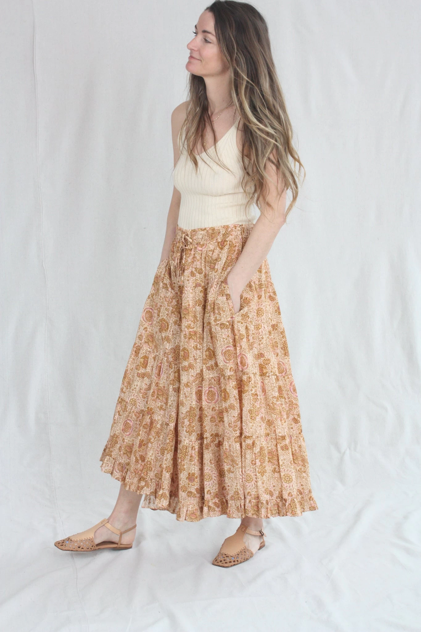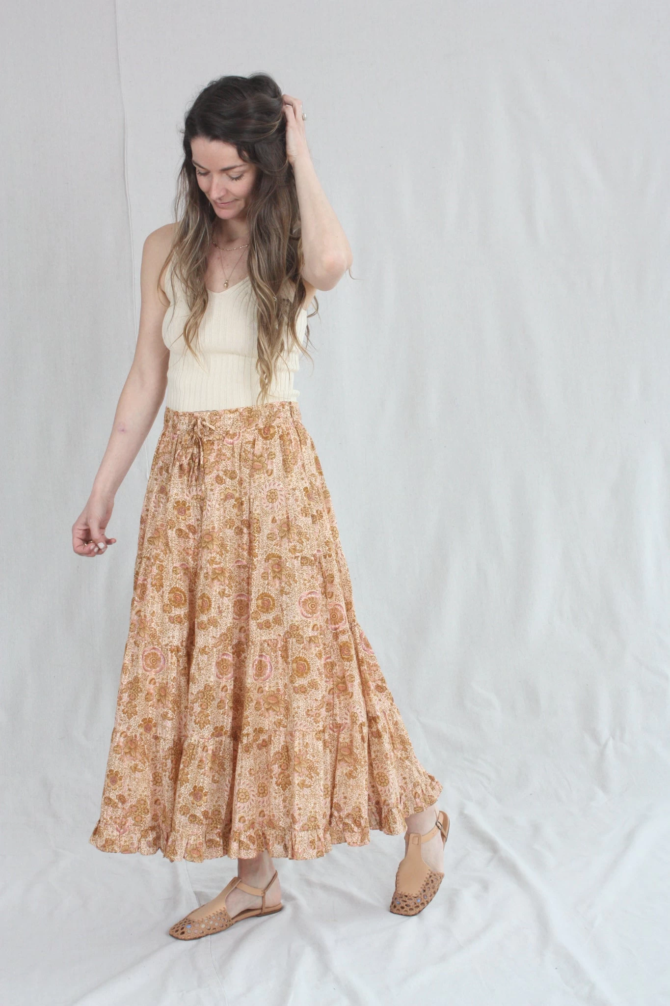 The Verity midi-length skirt is made up of five voluminous tiers, patterned in our Jardin Des Fleurs cotton shadow stripe in hues of dusty rose and muted green against a cream background. This midi-length skirt has a fixed waistband and a hidden side seam zipper.