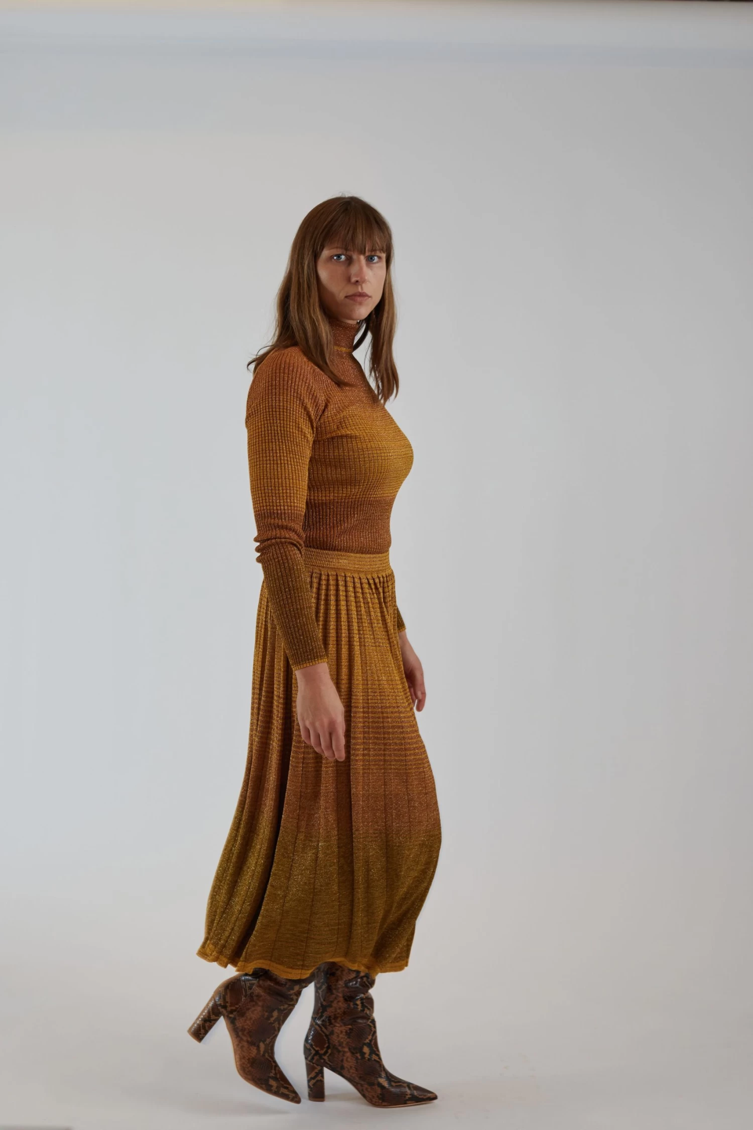 The Zayn Turtleneck is a lurex adorned Italian fine gauge knit top. Form fitting with long sleeve and fold down neck. Unlined.