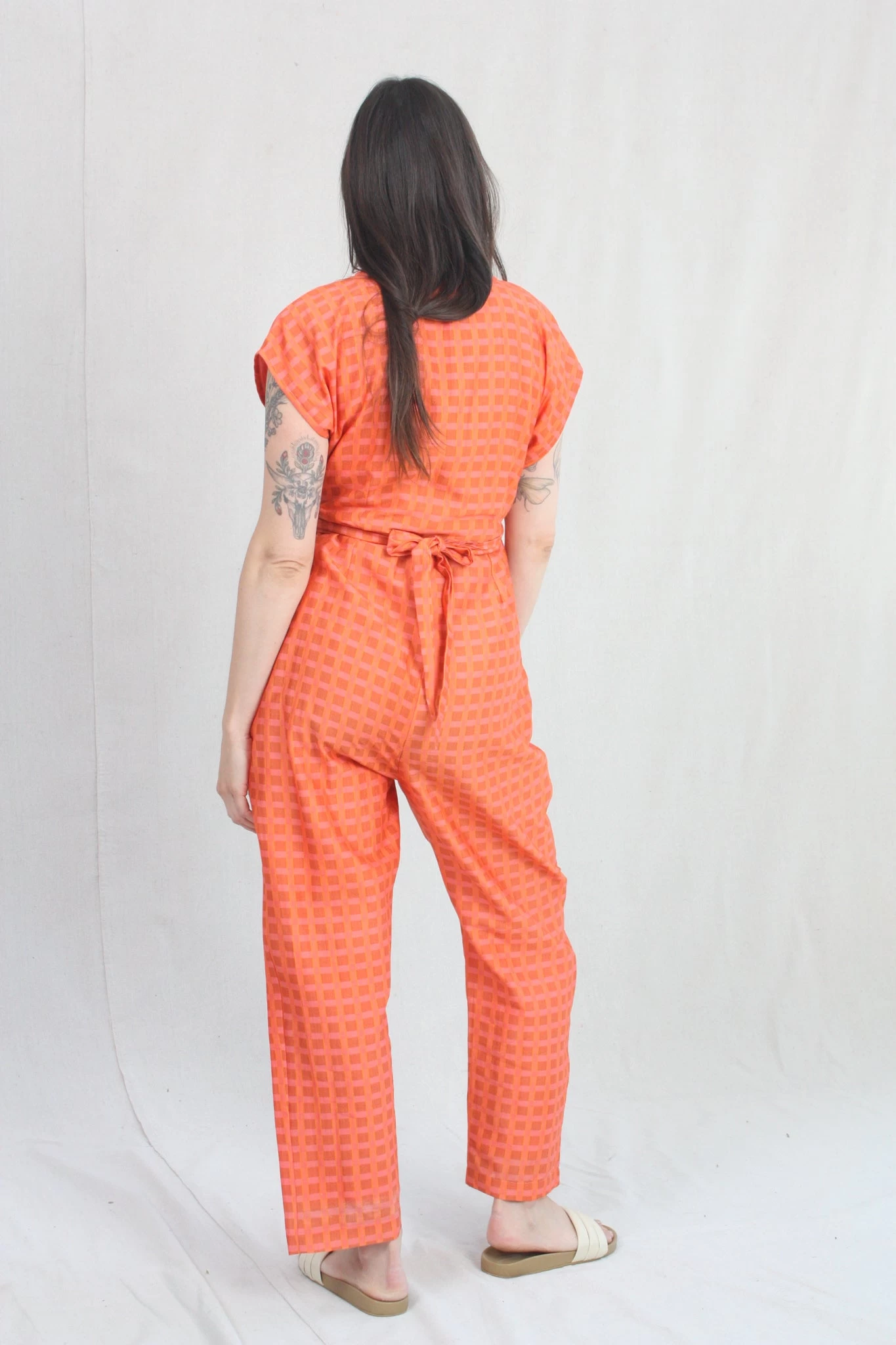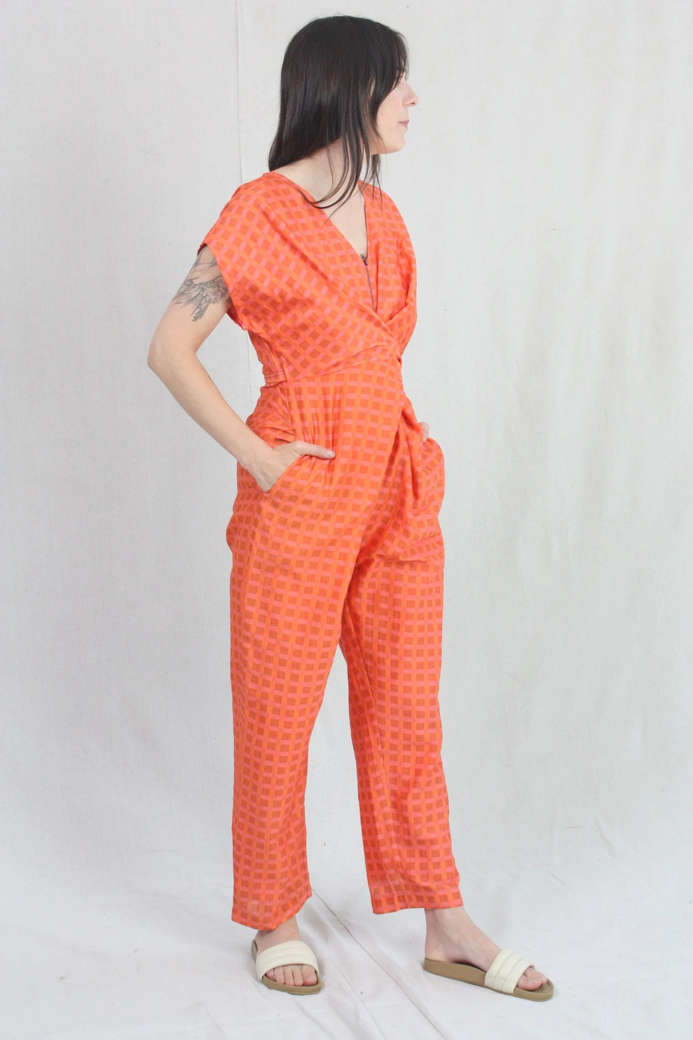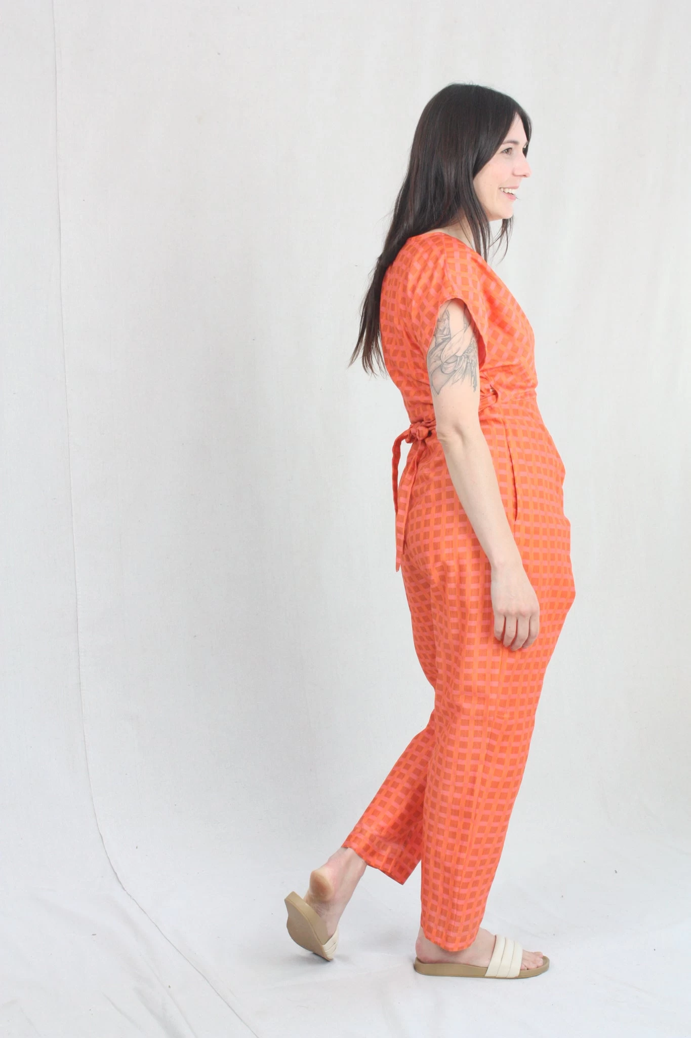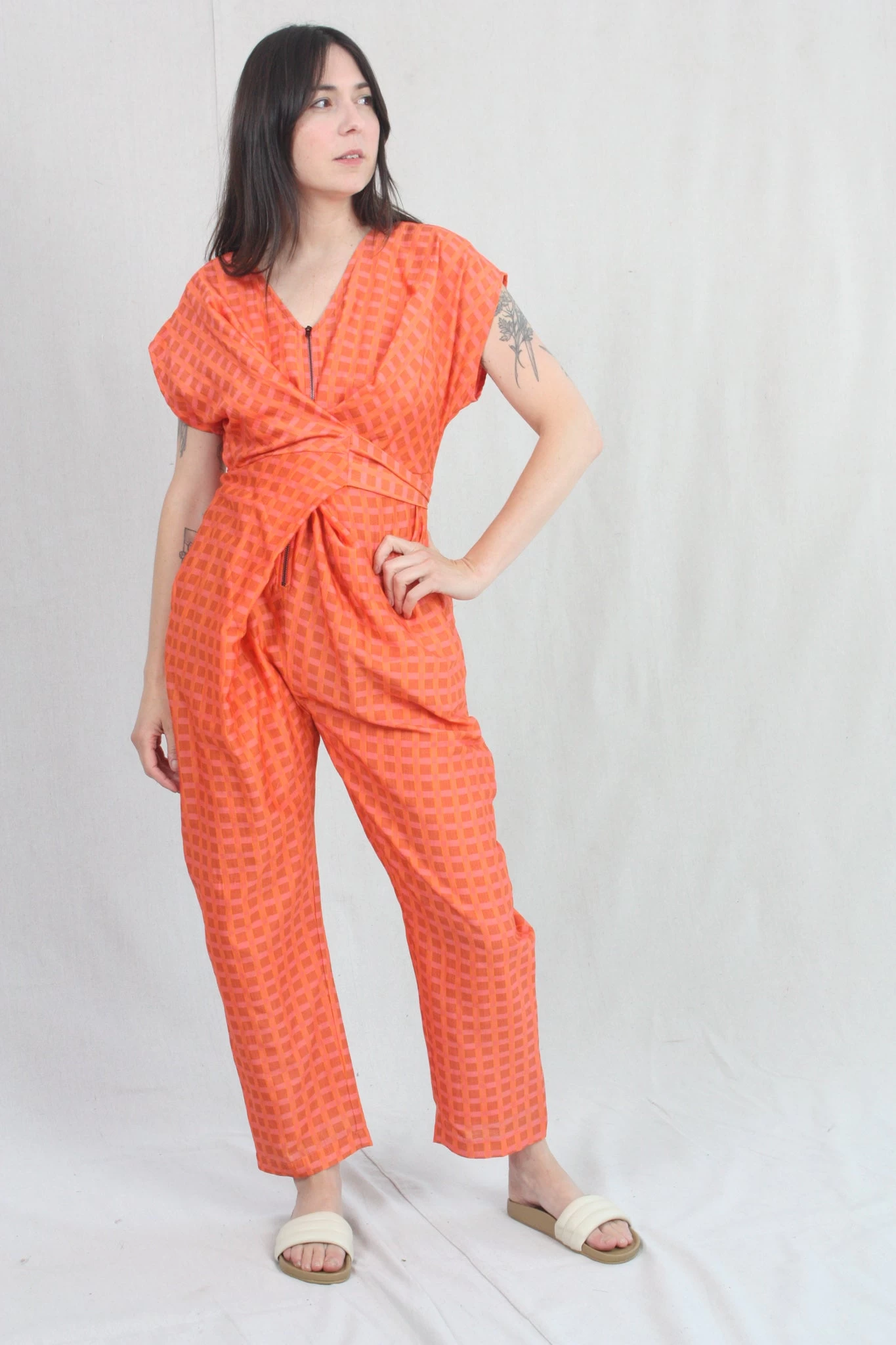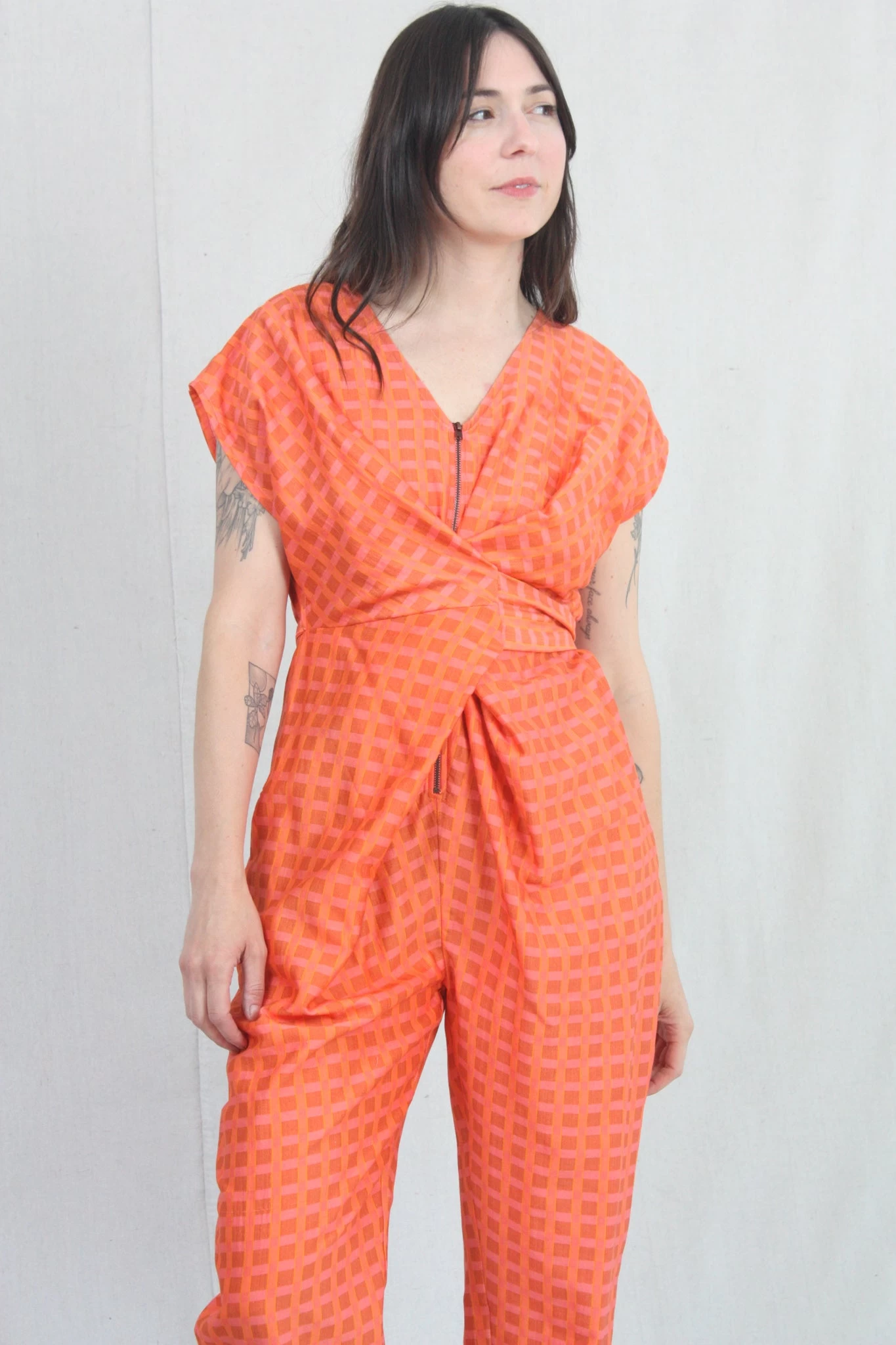 Short-sleeve jumper with wrap waist that can be tied in the front or back. Features zip up front hidden side pockets. Fits loosely but can be cinched at the waist as per body measurement or comfort! Bottom hem tapers for a sleek look and hem falls above the ankle. Can size down for a slimmer fit.