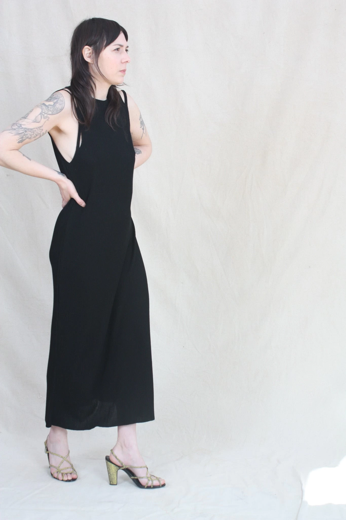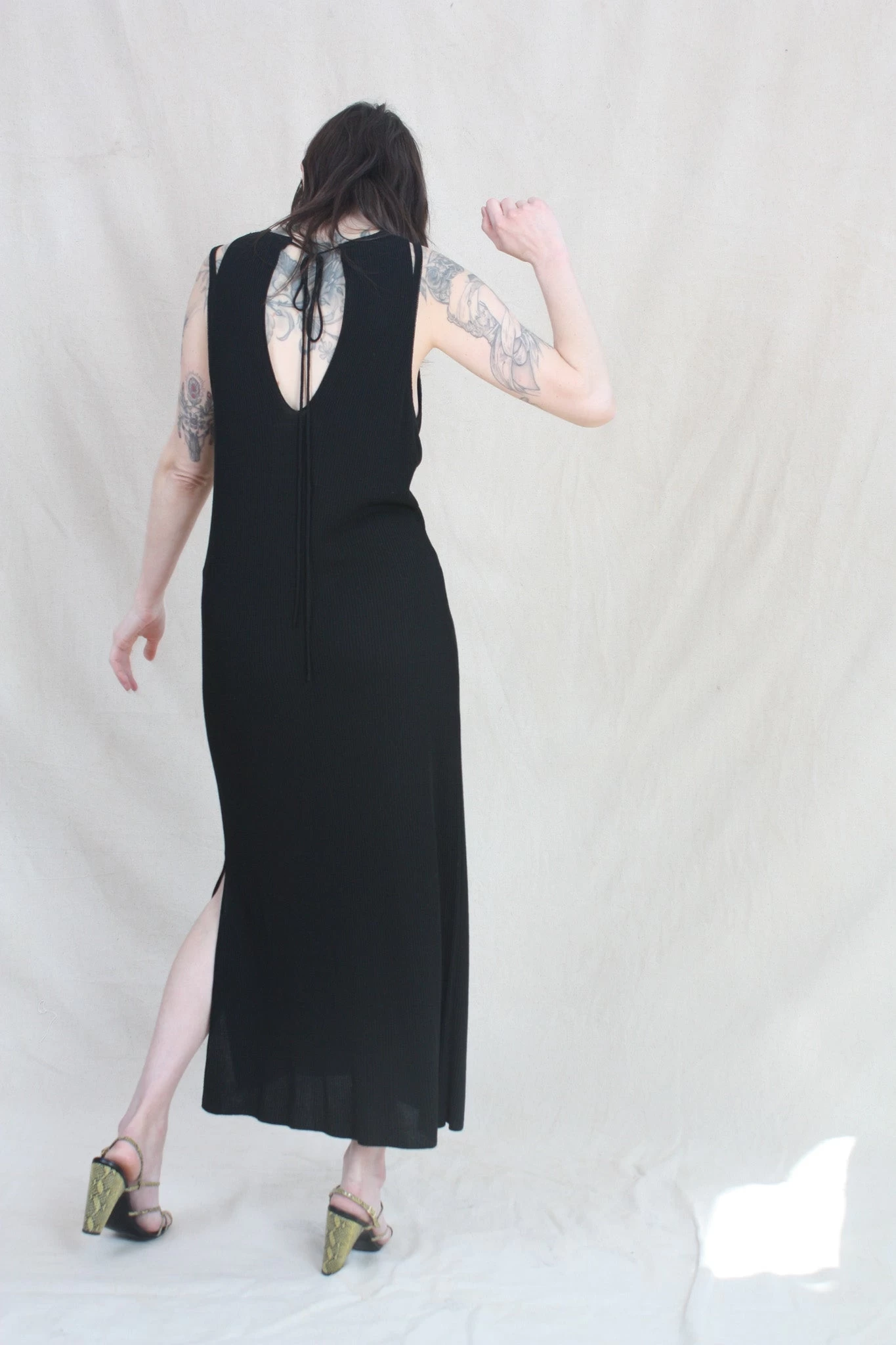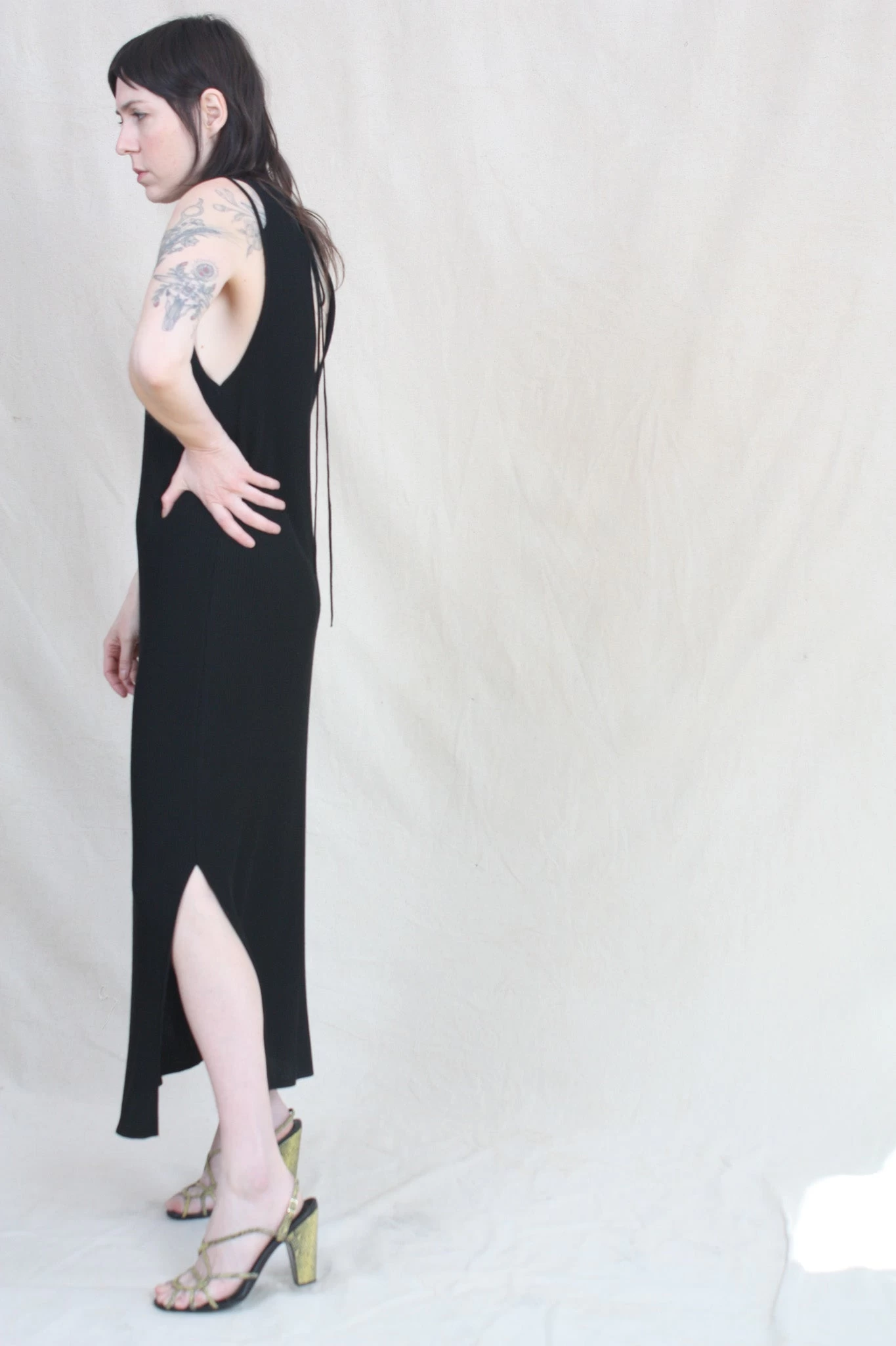Crafted from a fine ecological viscose in timeless black, this ribbed dress has been cut for a regular fit. It has an open gauze weave that’s slightly sheer. Features cut-out armholes and v-backline framed with straps for an optional closure.