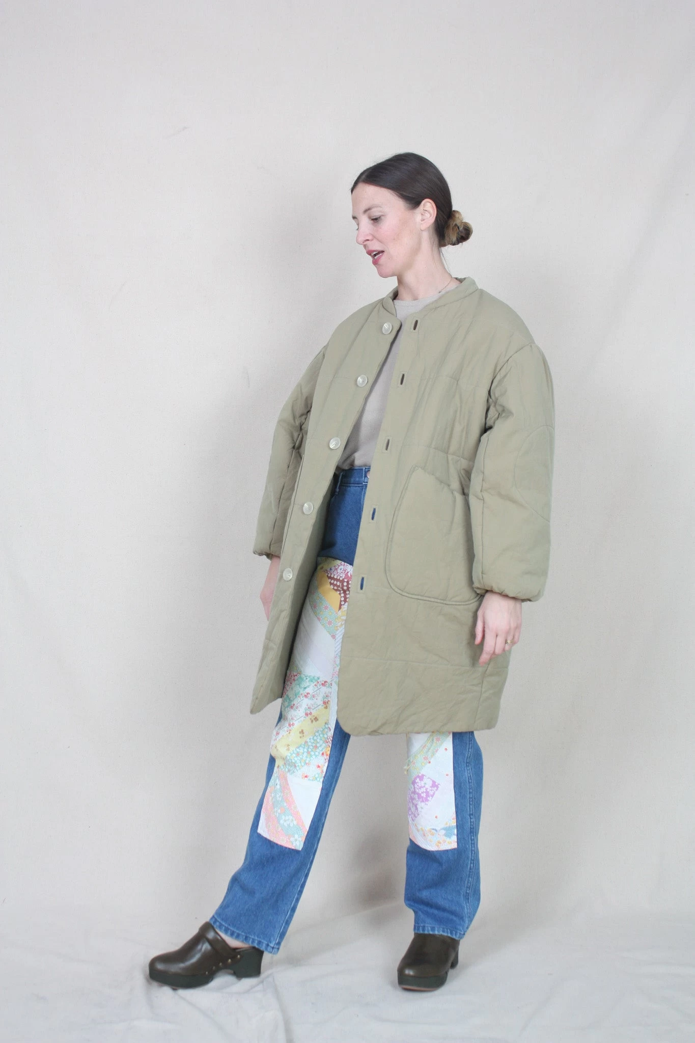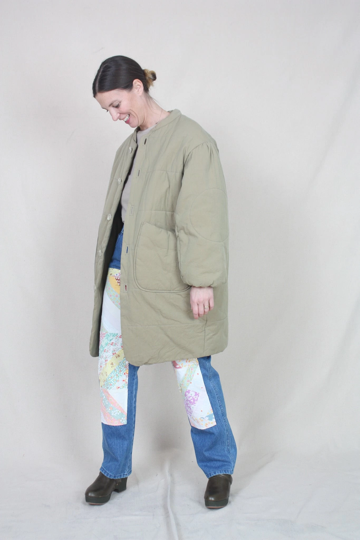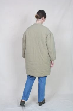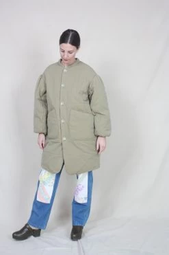 Warm and comfy wadded coat, with two oversized front pockets in a classic trench beige with green undertones.