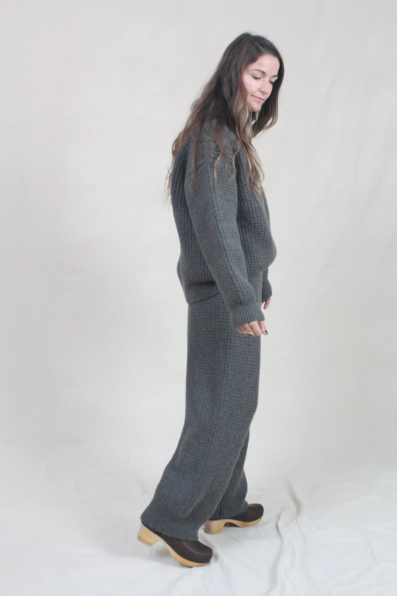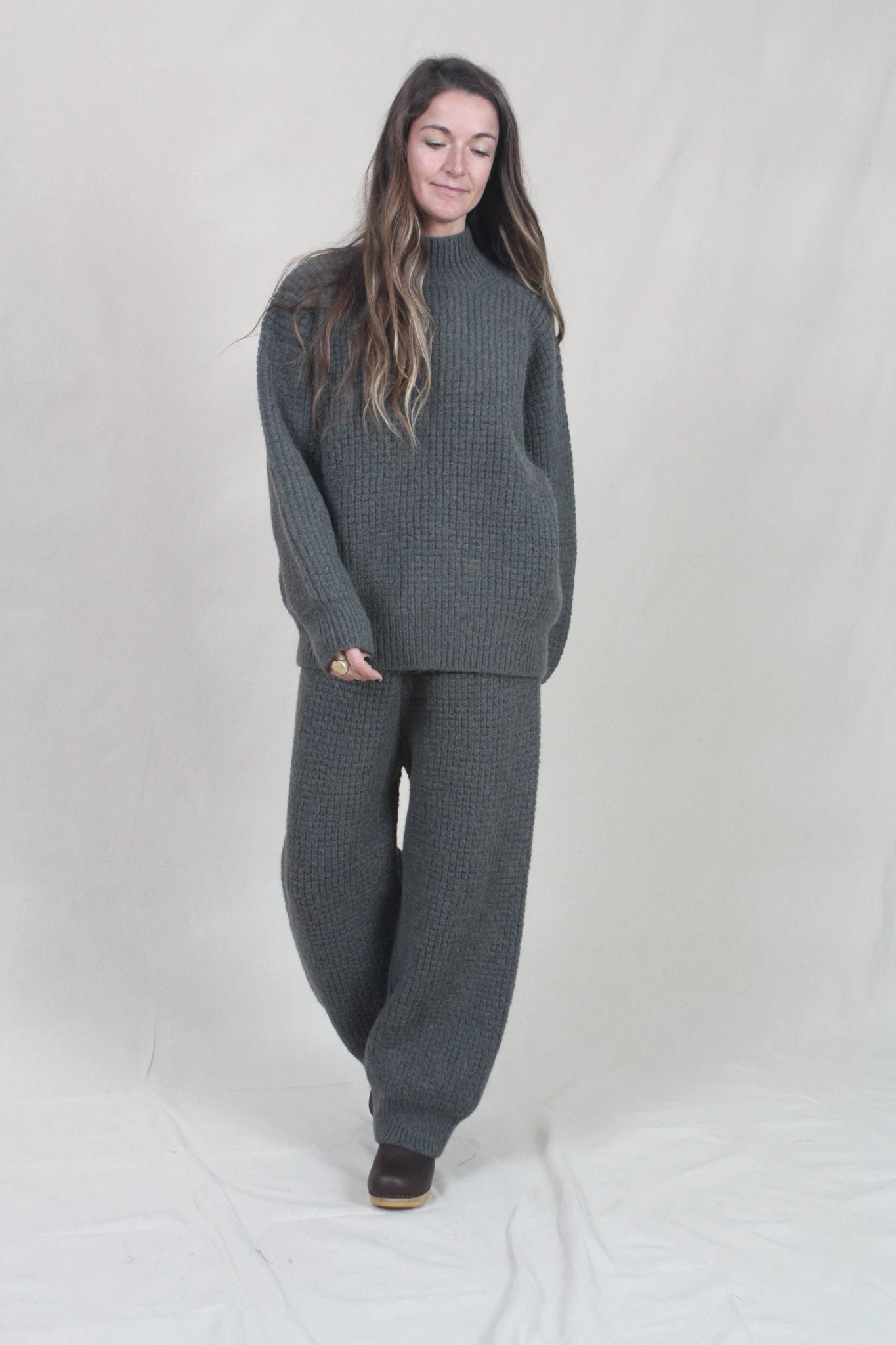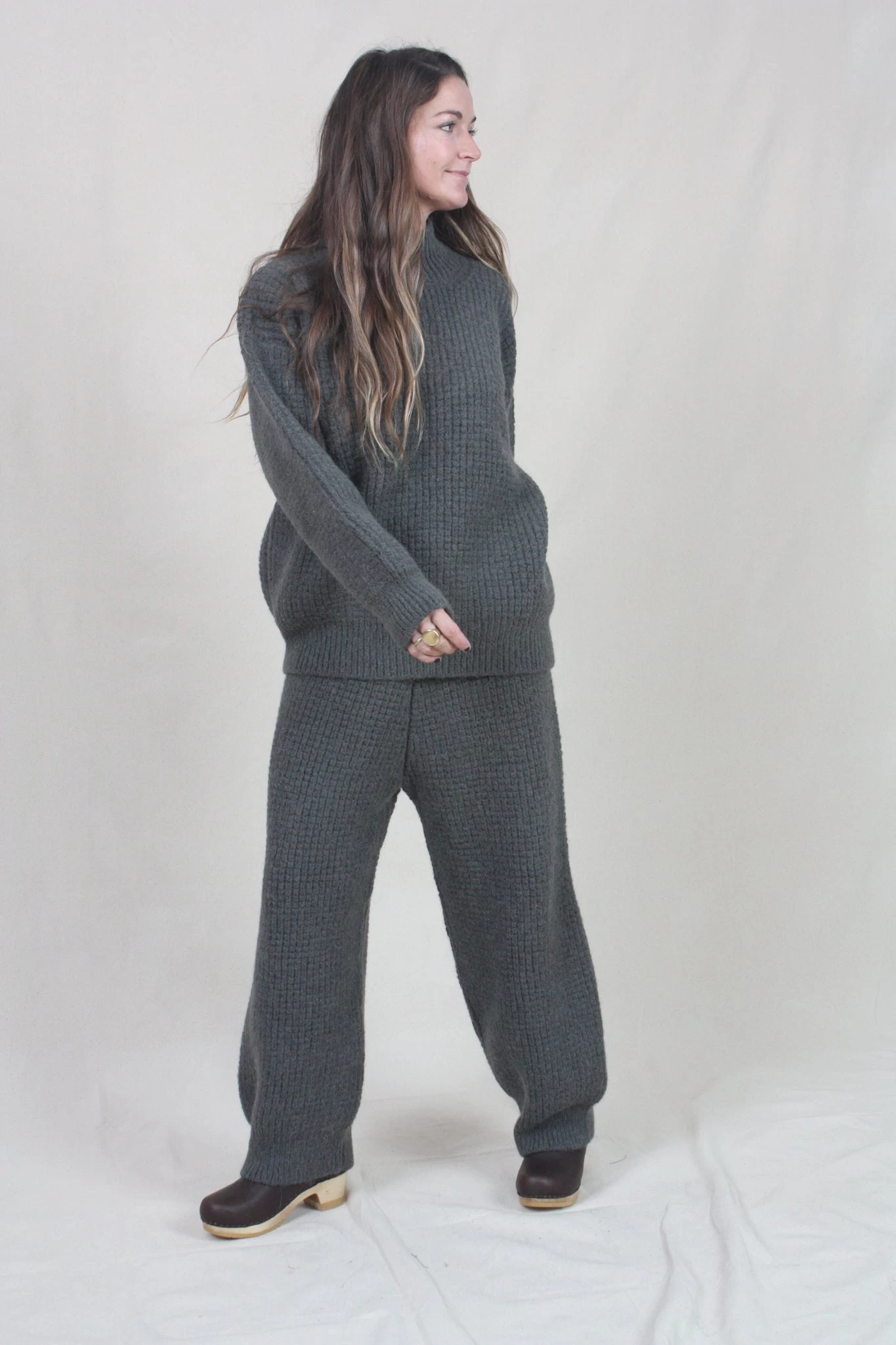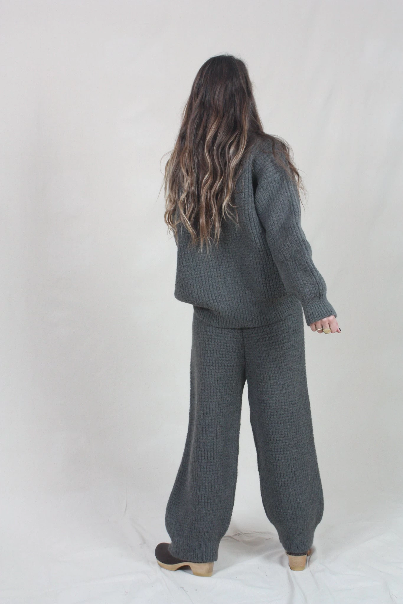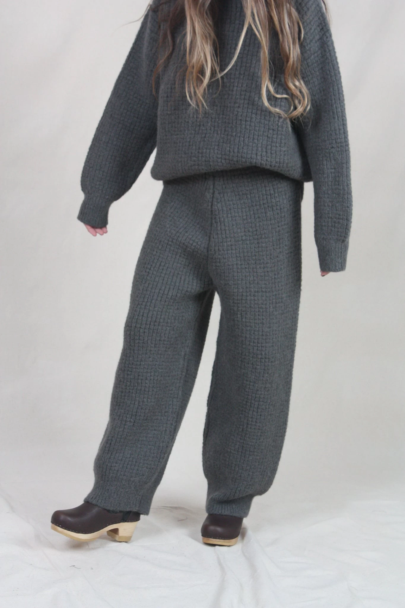Spongy grid stitch pant with elastic waist and rib cuff. Softly washed finish.