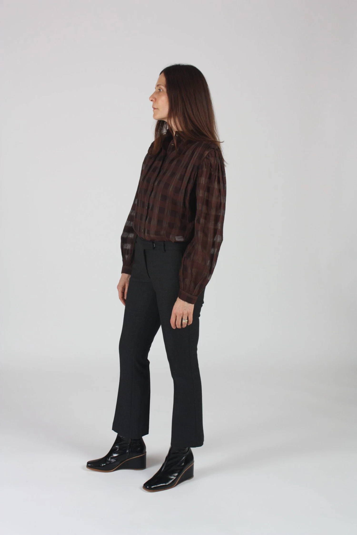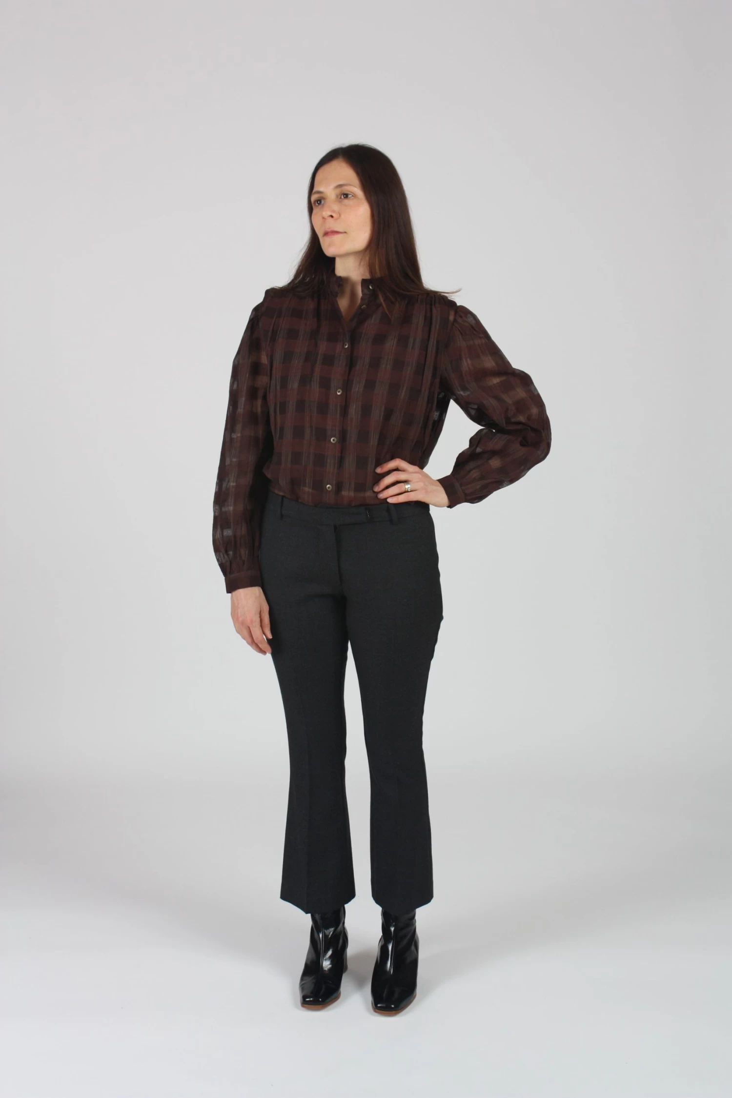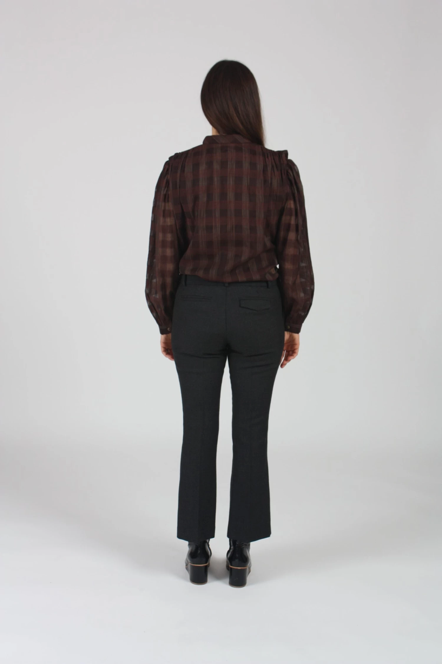 Low waist, fitted, crop flare pant, center front fly, creased leg, two front pockets, two back welt pockets.