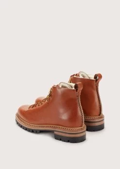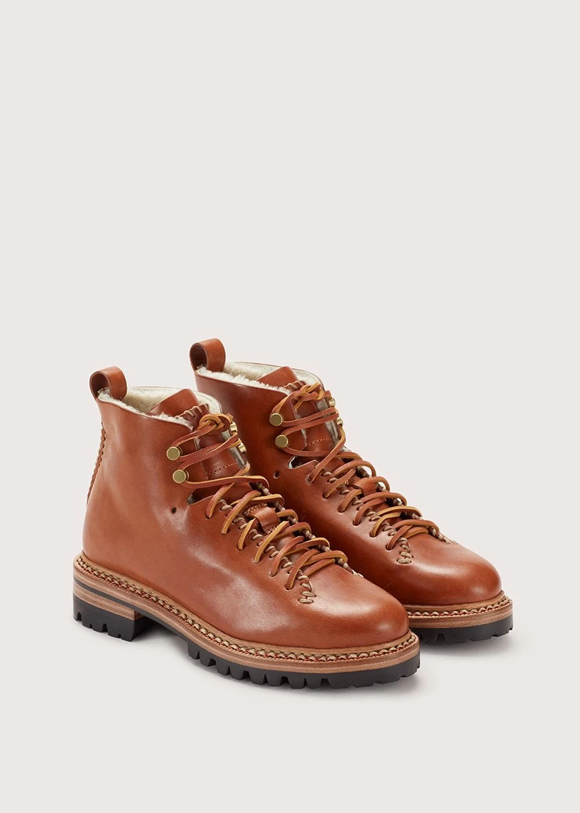 Each one-piece leather upper is lined with natural shearling wool for warmth and comfort, and Vibram gumlite outsoles and gusseted tongue construction improve water-resistance. Natural brass and silver wires are braided into the welt by hand, making this boot the first of its kind.
