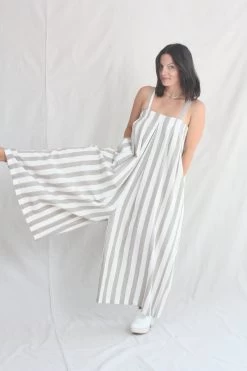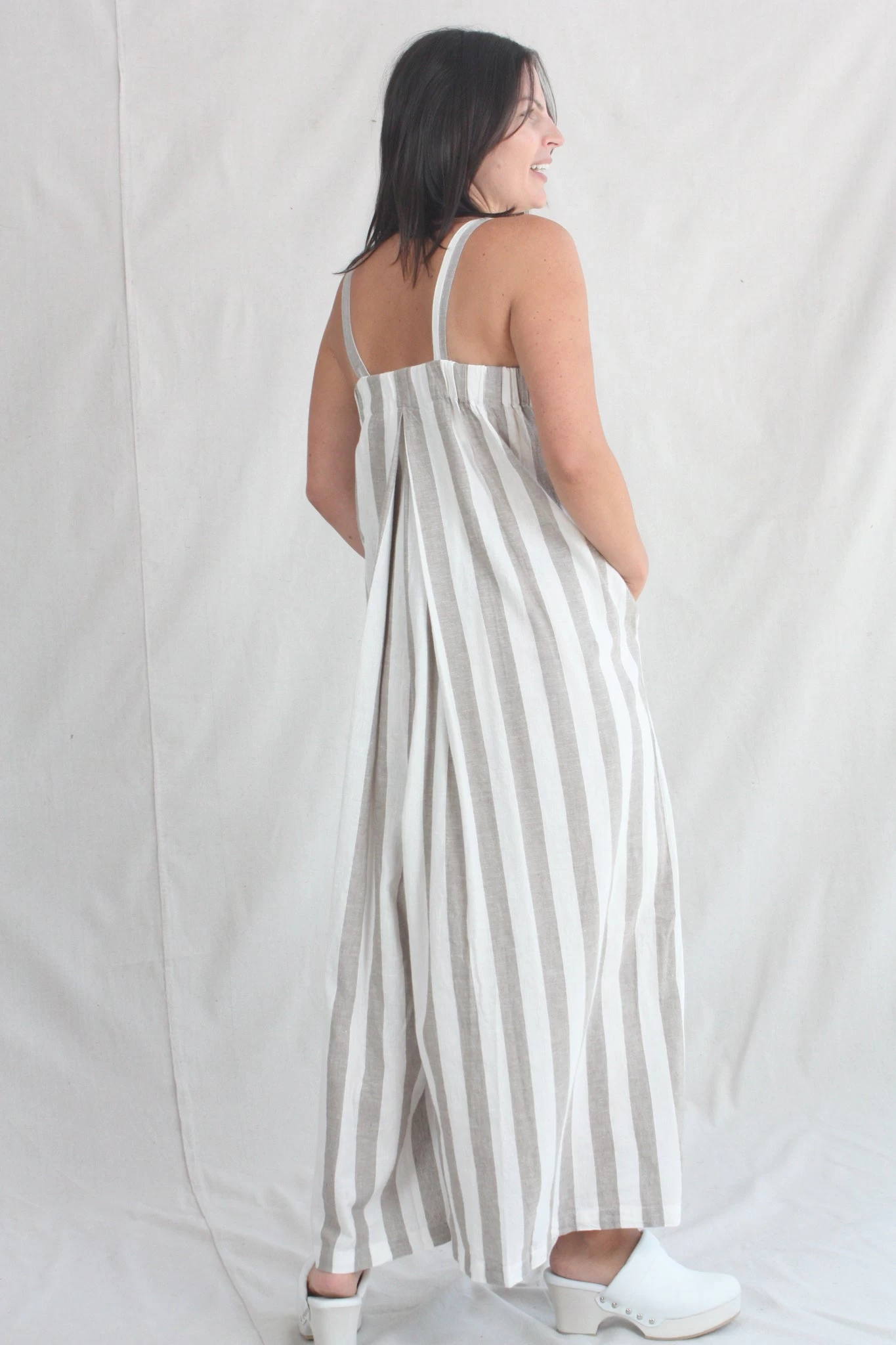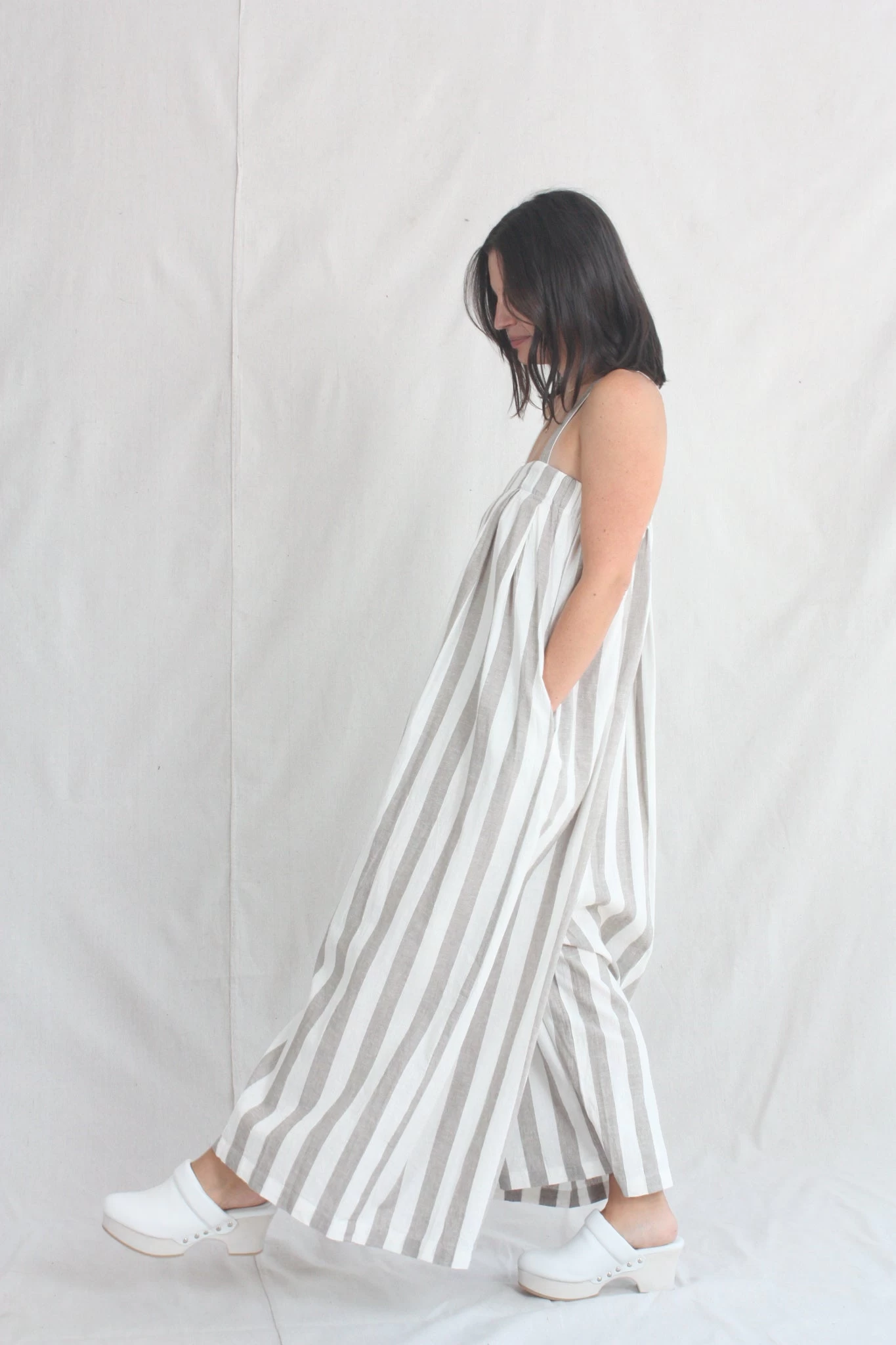 A relaxed, airy voluminous jumpsuit in a cotton, linen. Flat front neckline with a gathered elastic back. Inverted pleats at front and back center. Dropped crotch with wide legs. Side slit pockets.Â