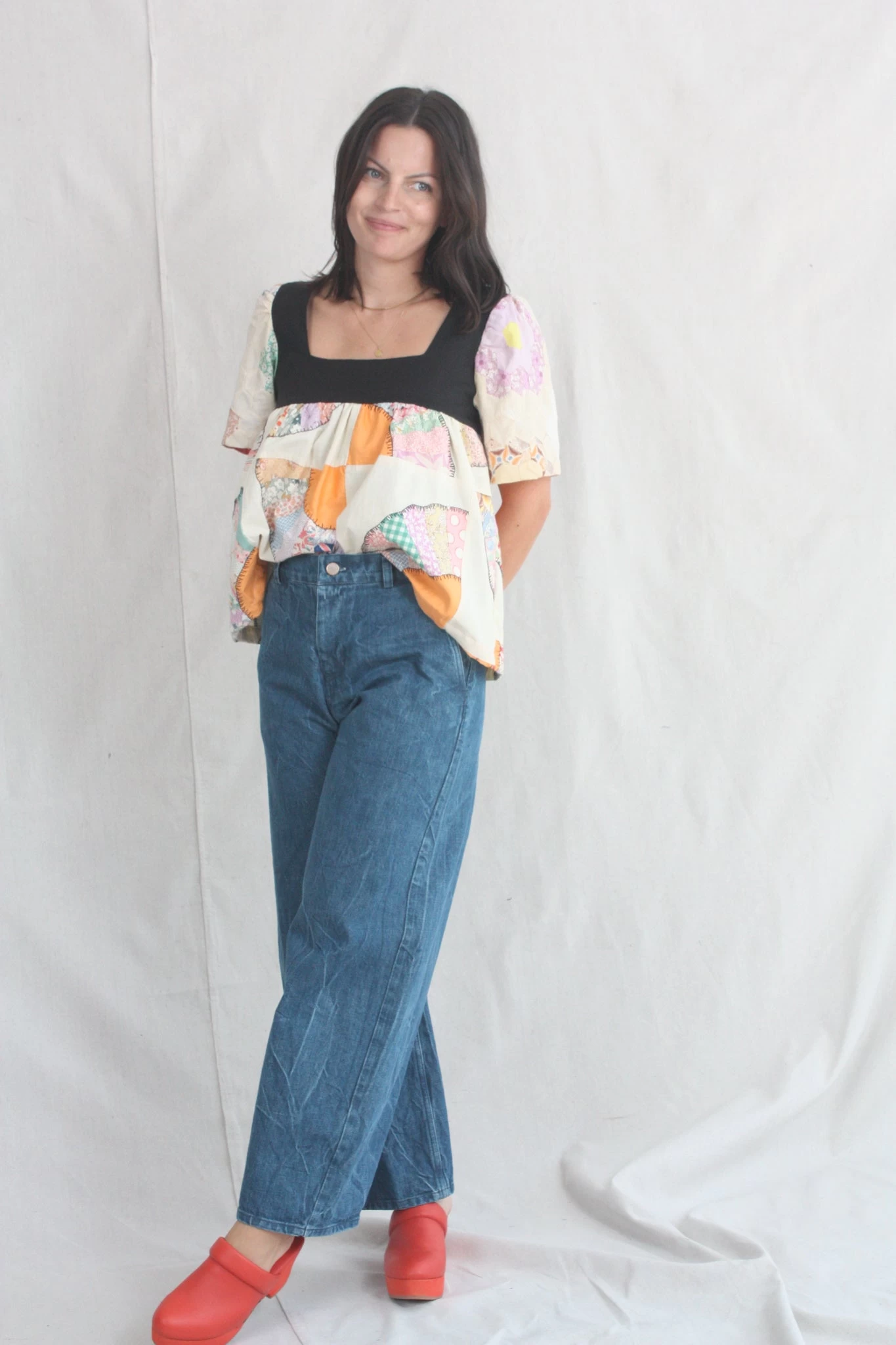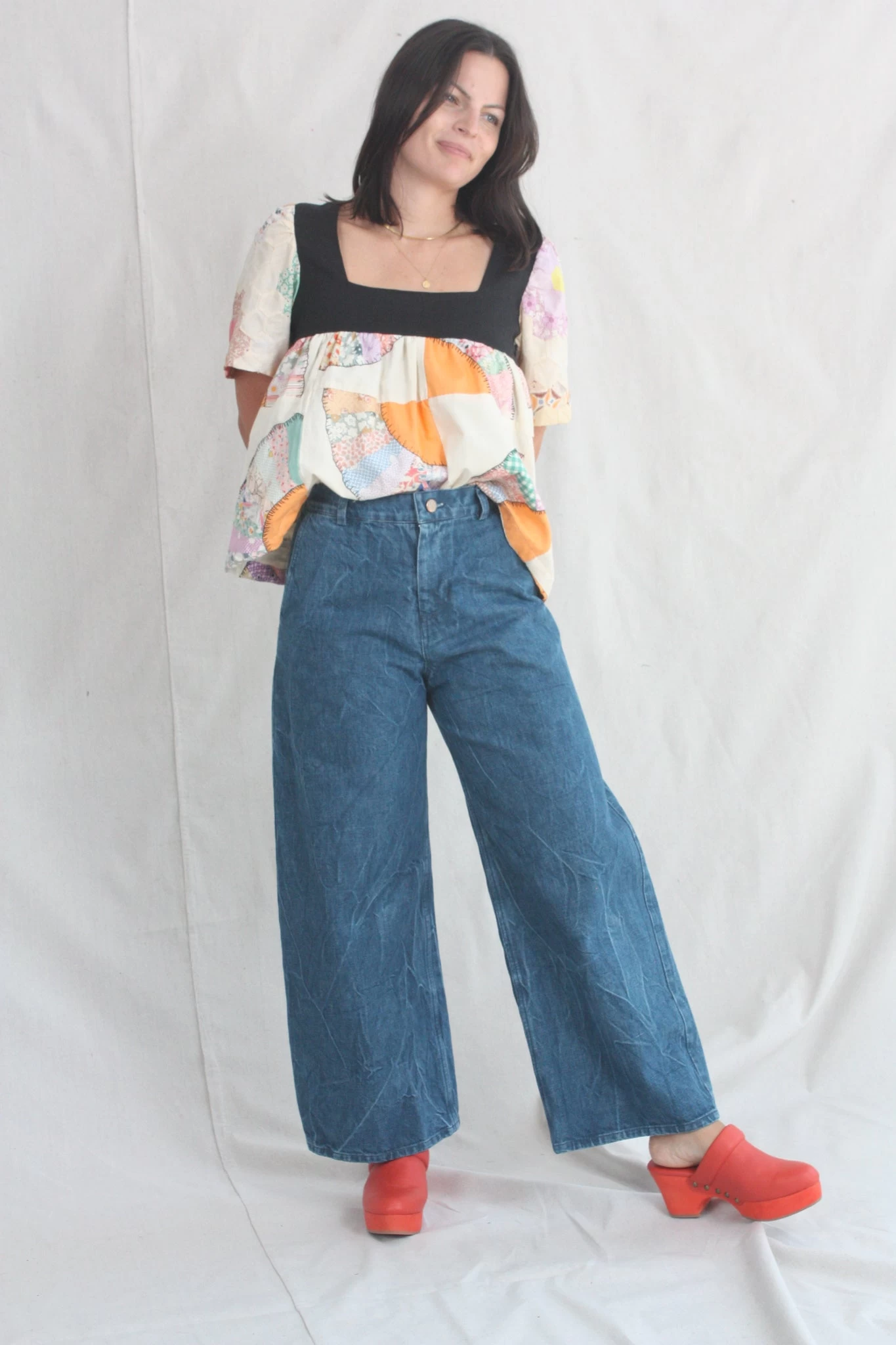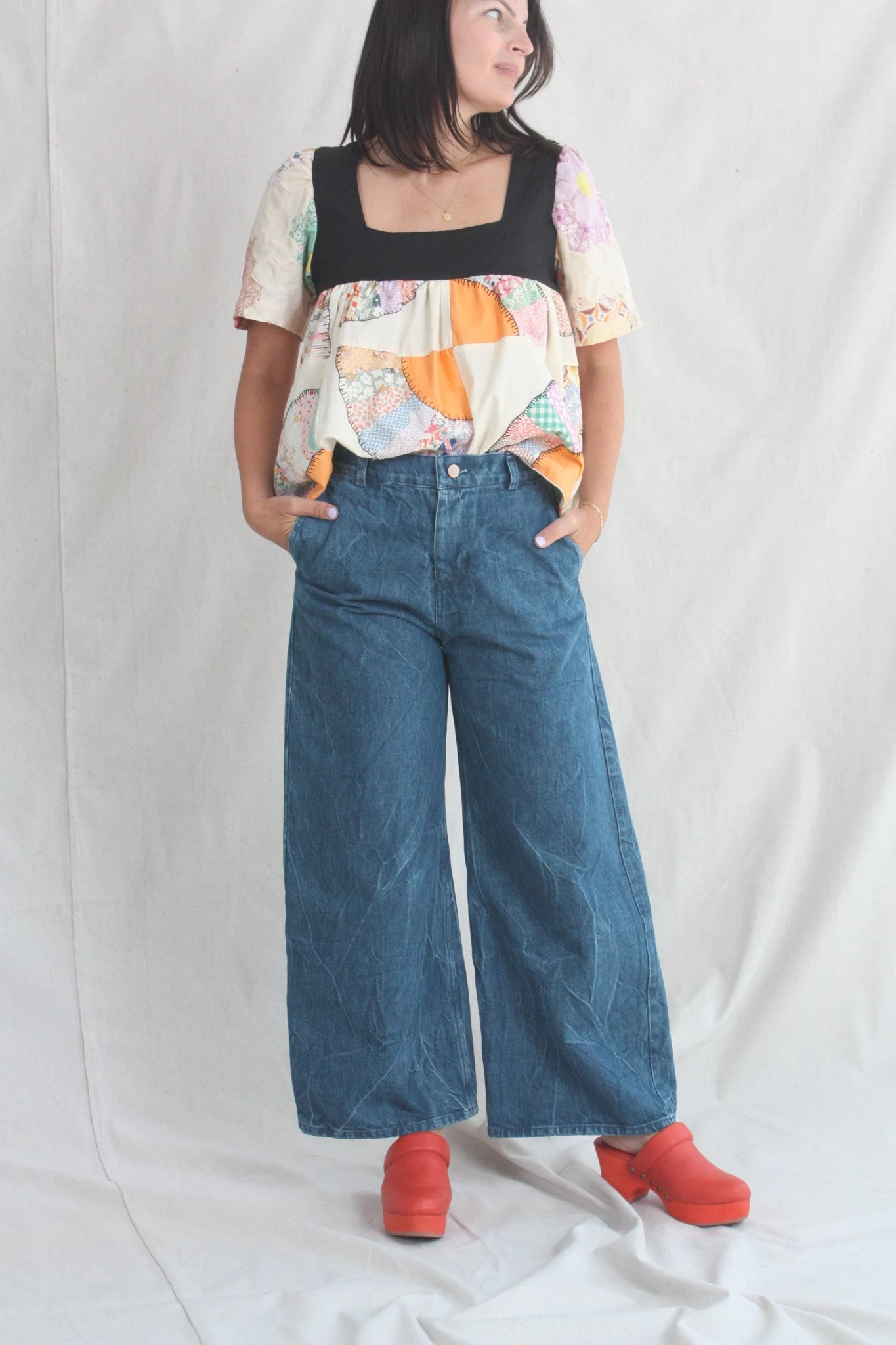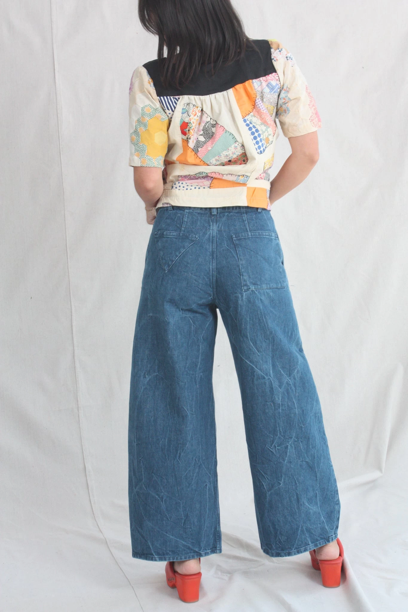 Wide leg cropped jean in a garment washed denim with subtle texture. Zip fly closure. Triangle and square back pocket details.