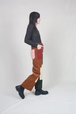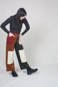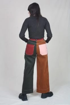A playful twist on classic corduroy trousers. Brings together corduroy patches in an array of earthy tones on a wide leg and high waist trouser. Includes classic utility patch pockets and belt loops.