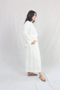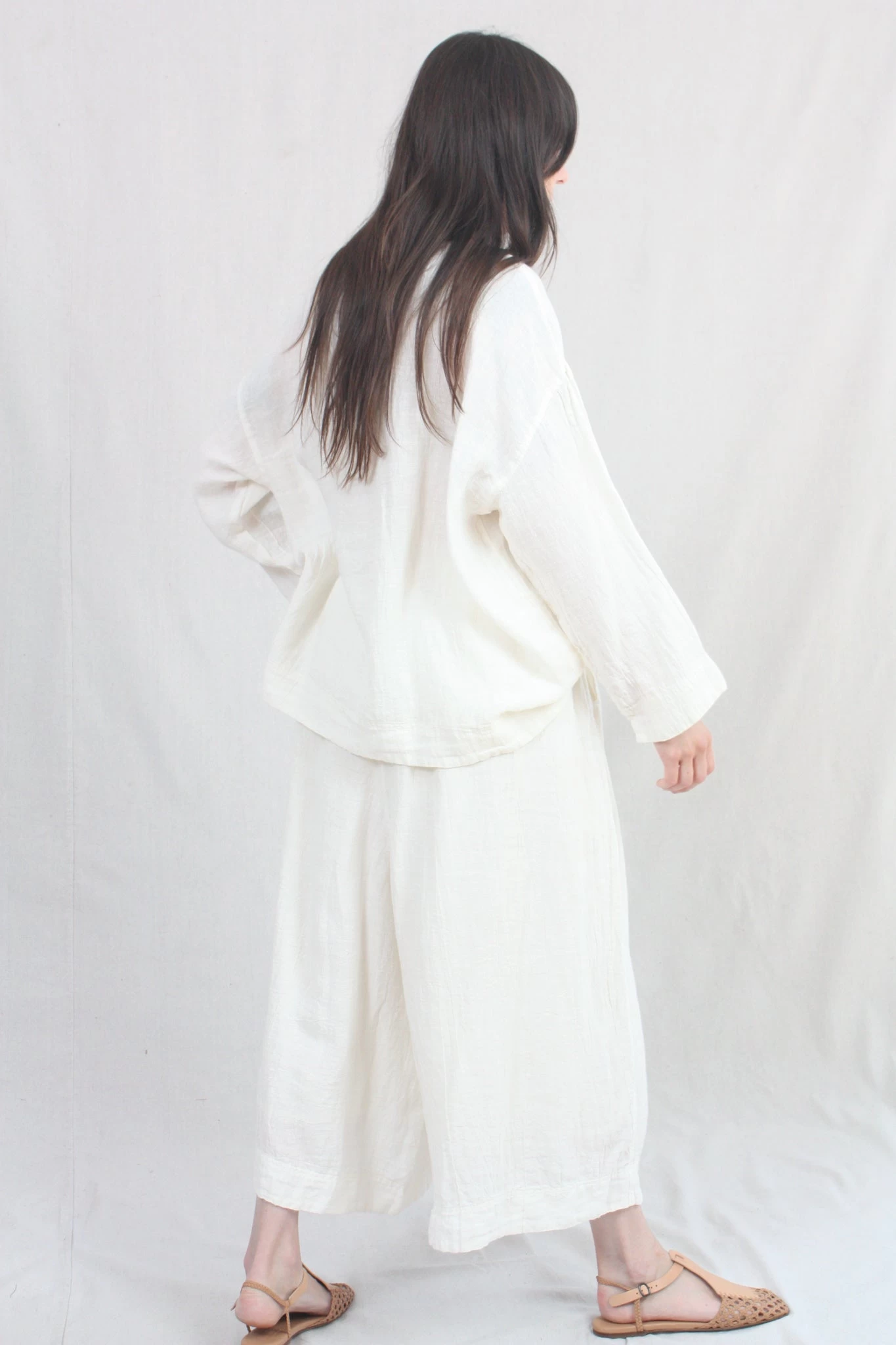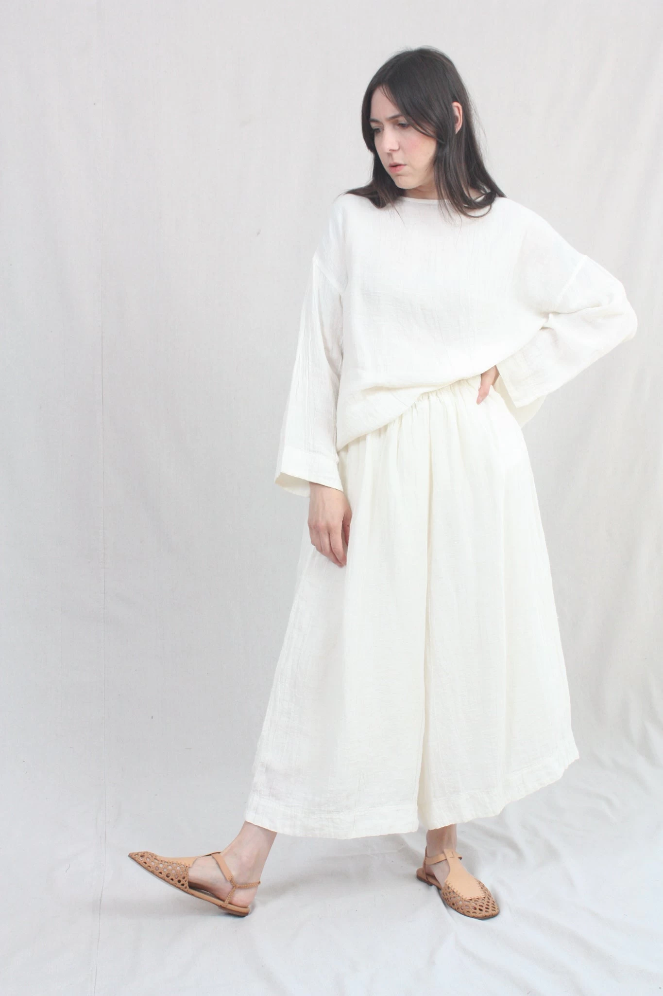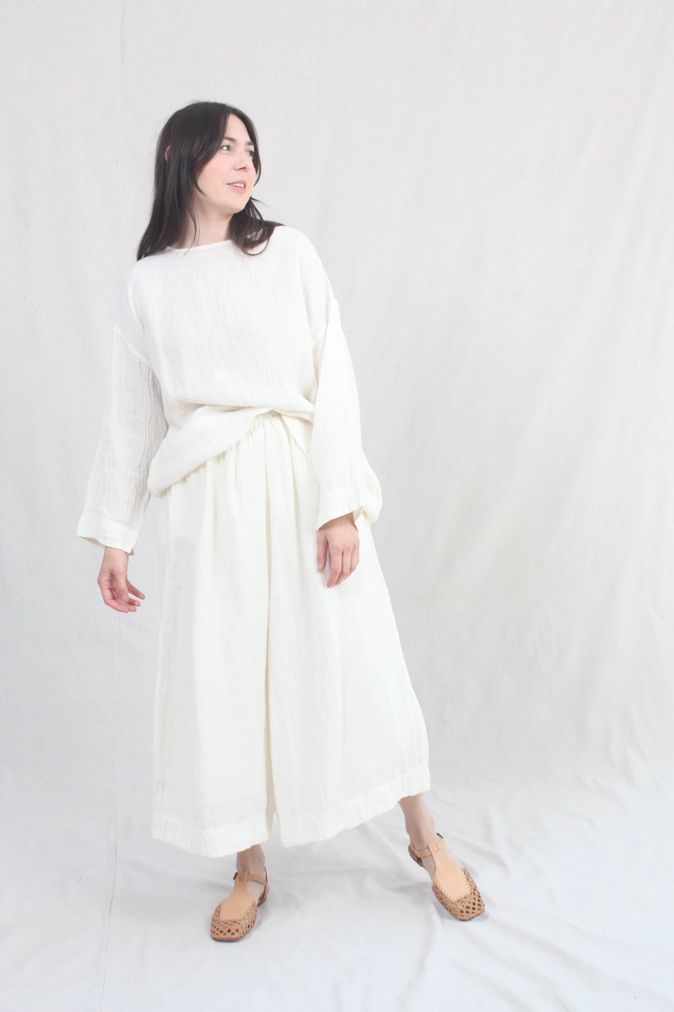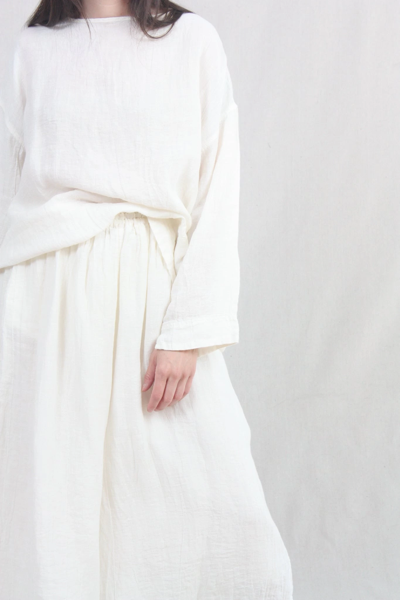 A classic pullover top in a crinkled linen woven with a boat neckline, dropped shoulders, long and loose sleeves. Relaxed, boxy silhouette.